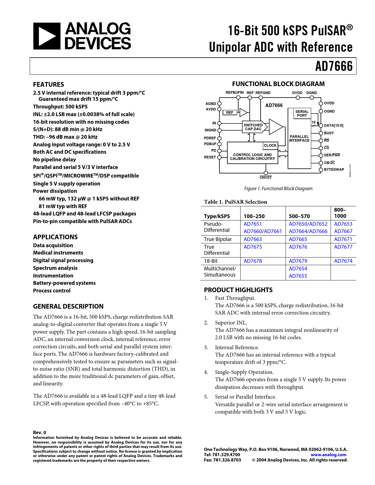 16-Bit 500 kSPS PulSAR®. Unipolar ADC with Reference. AD7666. FEATURES. FUNCTIONAL BLOCK DIAGRAM