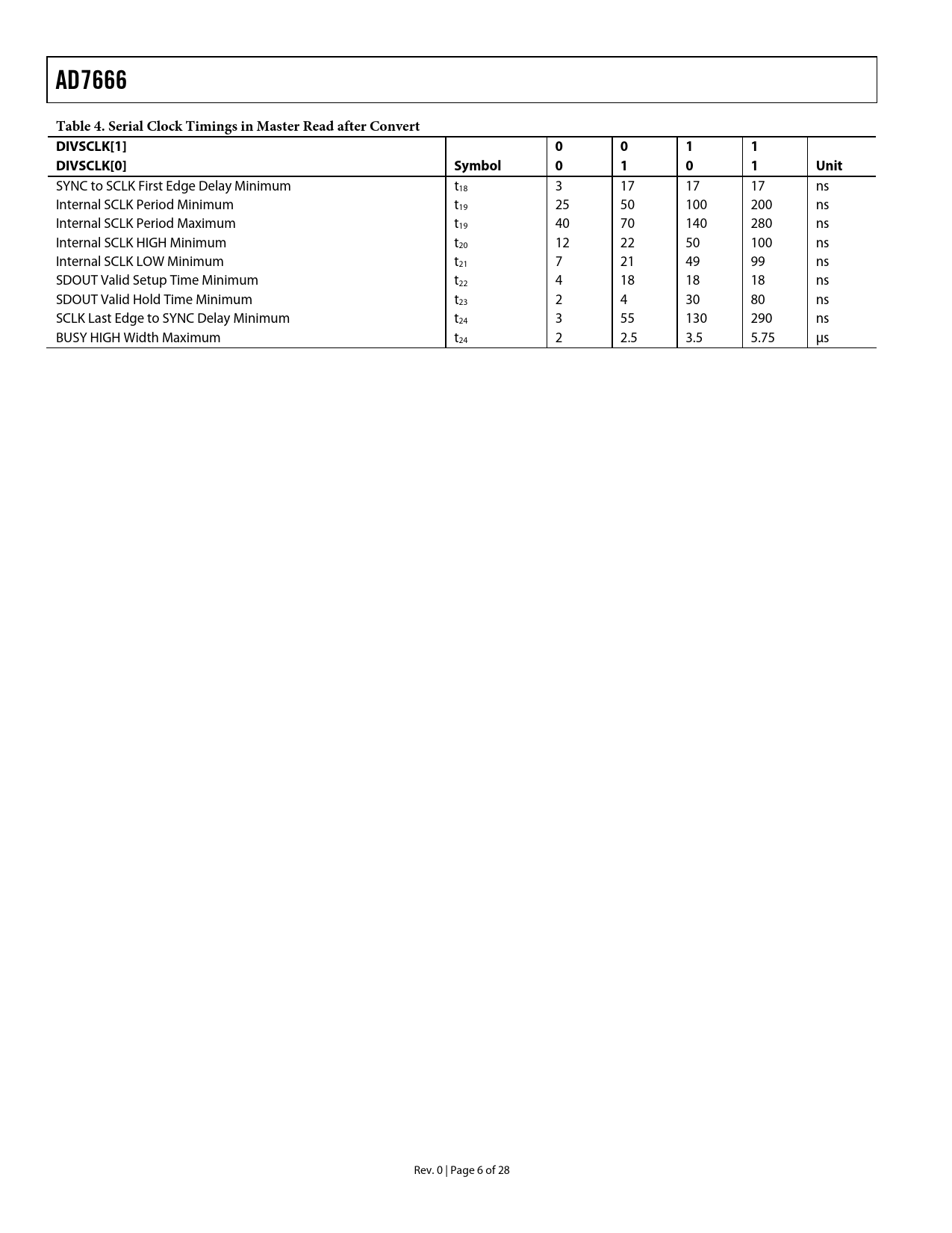 AD7666 Table 4. Serial Clock Timings in Master Read after Convert DIVSCLK[1] 0 0 1 1 DIVSCLK[0] Symbol 0 1 0 1 Unit