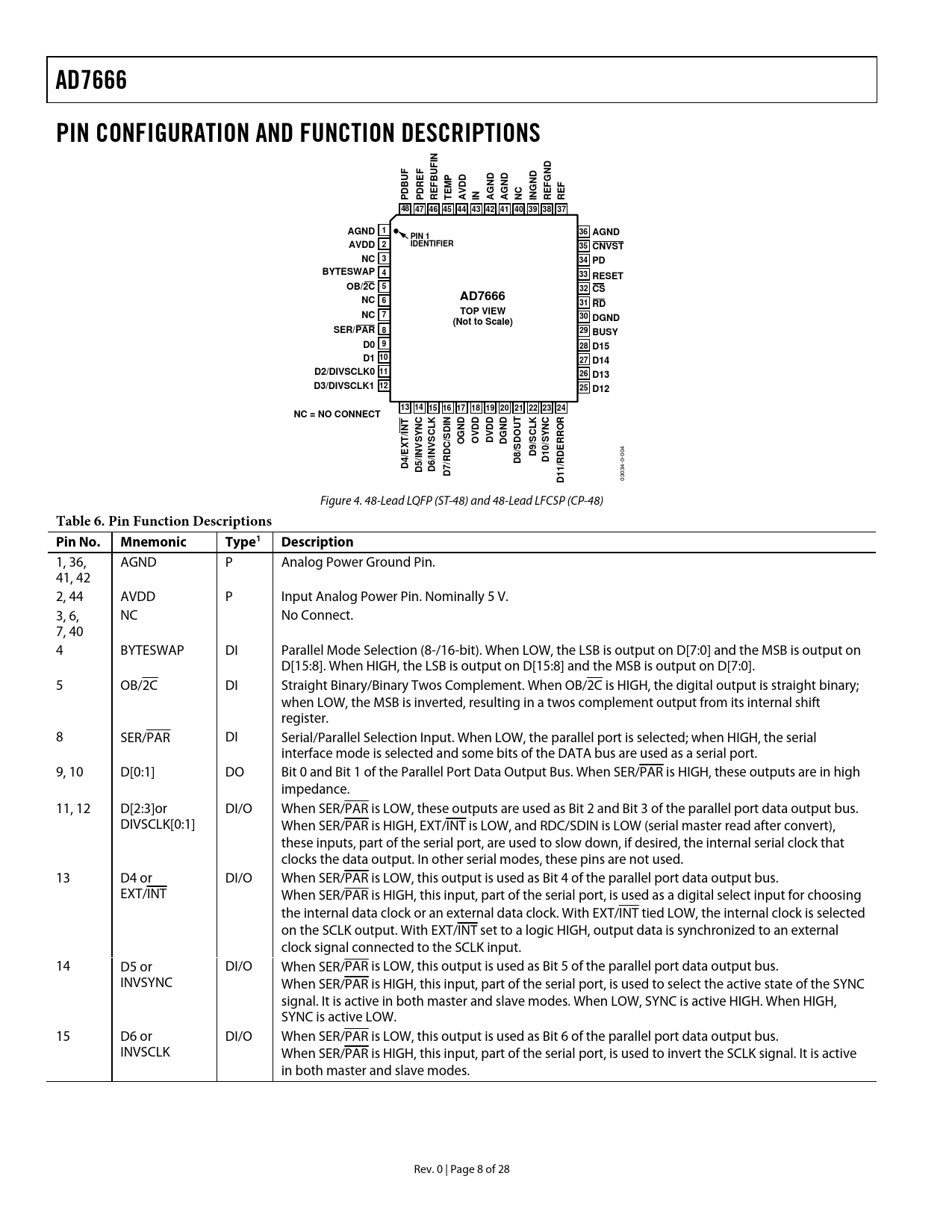 AD7666 PIN CONFIGURATION AND FUNCTION DESCRIPTIONS FBUFIN FGND DBUF DRE TEMP AGND INGND 48 47 46 45 44 43 42 41 40 39 38 37 PIN 1