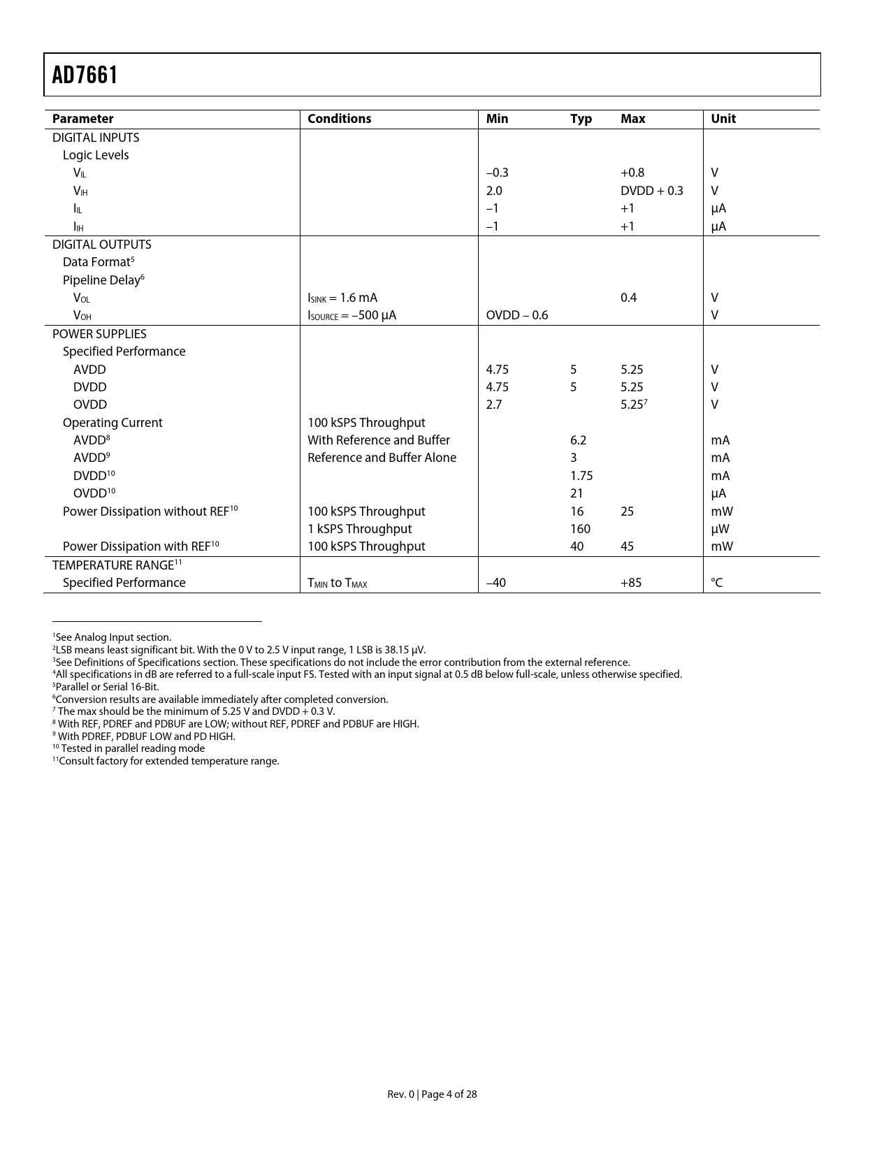 link to page 5 link to page 5 link to page 5 link to page 5 link to page 5 link to page 5 link to page 6 AD7661Parameter ConditionsMinTypMaxUnit DIGITAL INPUTS Logic Levels VIL –0.3 +0.8 V VIH 2.0 DVDD + 0.3 V IIL –1 +1 µA IIH –1 +1 µA DIGITAL OUTPUTS Data Format5 Pipeline Delay6 VOL ISINK = 1.6 mA 0.4 V VOH ISOURCE = –500 µA OVDD – 0.6 V POWER SUPPLIES Specified Performance AVDD 4.75 5 5.25 V DVDD 4.75 5 5.25 V OVDD 2.7 5.257 V Operating Current 100 kSPS Throughput AVDD8 With Reference and Buffer 6.2 mA AVDD9 Reference and Buffer Alone 3 mA DVDD10 1.75 mA OVDD10 21 µA Power Dissipation without REF10 100 kSPS Throughput 16 25 mW 1 kSPS Throughput 160 µW Power Dissipation with REF10 100 kSPS Throughput 40 45 mW TEMPERATURE RANGE11 Specified Performance TMIN to TMAX –40 +85 °C 1See Analog Input section. 2LSB means least significant bit. With the 0 V to 2.5 V input range, 1 LSB is 38.15 µV. 3See Definitions of Specifications section. These specifications do not include the error contribution from the external reference. 4All specifications in dB are referred to a full-scale input FS. Tested with an input signal at 0.5 dB below full-scale, unless otherwise specified. 5Parallel or Serial 16-Bit. 6Conversion results are available immediately after completed conversion. 7 The max should be the minimum of 5.25 V and DVDD + 0.3 V. 8 With REF, PDREF and PDBUF are LOW; without REF, PDREF and PDBUF are HIGH. 9 With PDREF, PDBUF LOW and PD HIGH. 10 Tested in parallel reading mode 11Consult factory for extended temperature range. Rev. 0 | Page 4 of 28 Document Outline FEATURES APPLICATIONS GENERAL DESCRIPTION FUNCTIONAL BLOCK DIAGRAM PRODUCT HIGHLIGHTS SPECIFICATIONS TIMING SPECIFICATIONS ABSOLUTE MAXIMUM RATINGS ESD CAUTION PIN CONFIGURATION AND FUNCTION DESCRIPTIONS DEFINITIONS OF SPECIFICATIONS TYPICAL PERFORMANCE CHARACTERISTICS CIRCUIT INFORMATION CONVERTER OPERATION Transfer Functions TYPICAL CONNECTION DIAGRAM Analog Input Driver Amplifier Choice Voltage Reference Input Power Supply POWER DISSIPATION VERSUS THROUGHPUT CONVERSION CONTROL DIGITAL INTERFACE PARALLEL INTERFACE SERIAL INTERFACE MASTER SERIAL INTERFACE Internal Clock SLAVE SERIAL INTERFACE External Clock External Discontinuous Clock Data Read After Conversion External Clock Data Read During Conversion MICROPROCESSOR INTERFACING SPI Interface (ADSP-219x) APPLICATION HINTS BIPOLAR AND WIDER INPUT RANGES LAYOUT EVALUATING THE AD7661’S PERFORMANCE OUTLINE DIMENSIONS ORDERING GUIDE