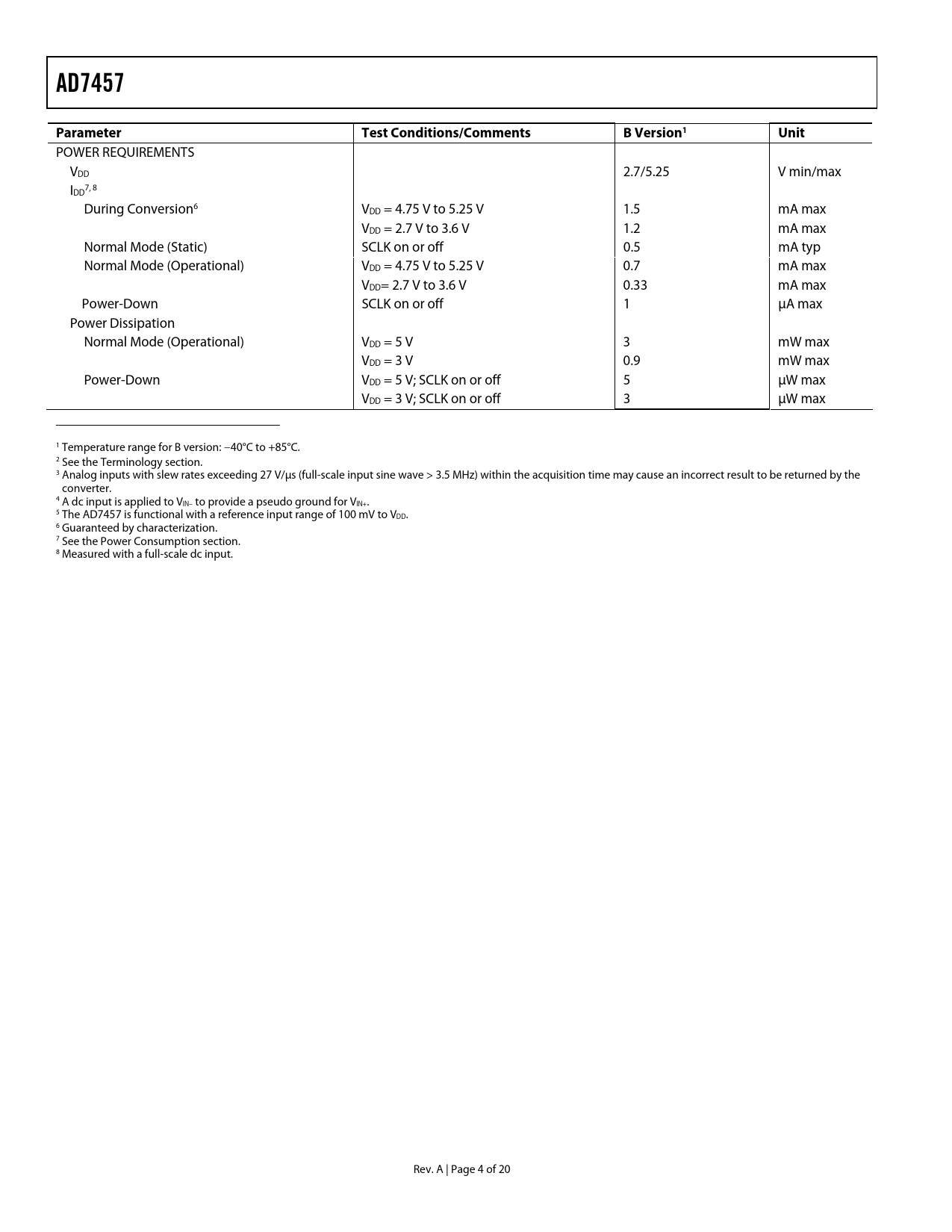 Seiten / Seite21 / 5 — AD7457. Parameter. Test Conditions/Comments. B Version1. Unit