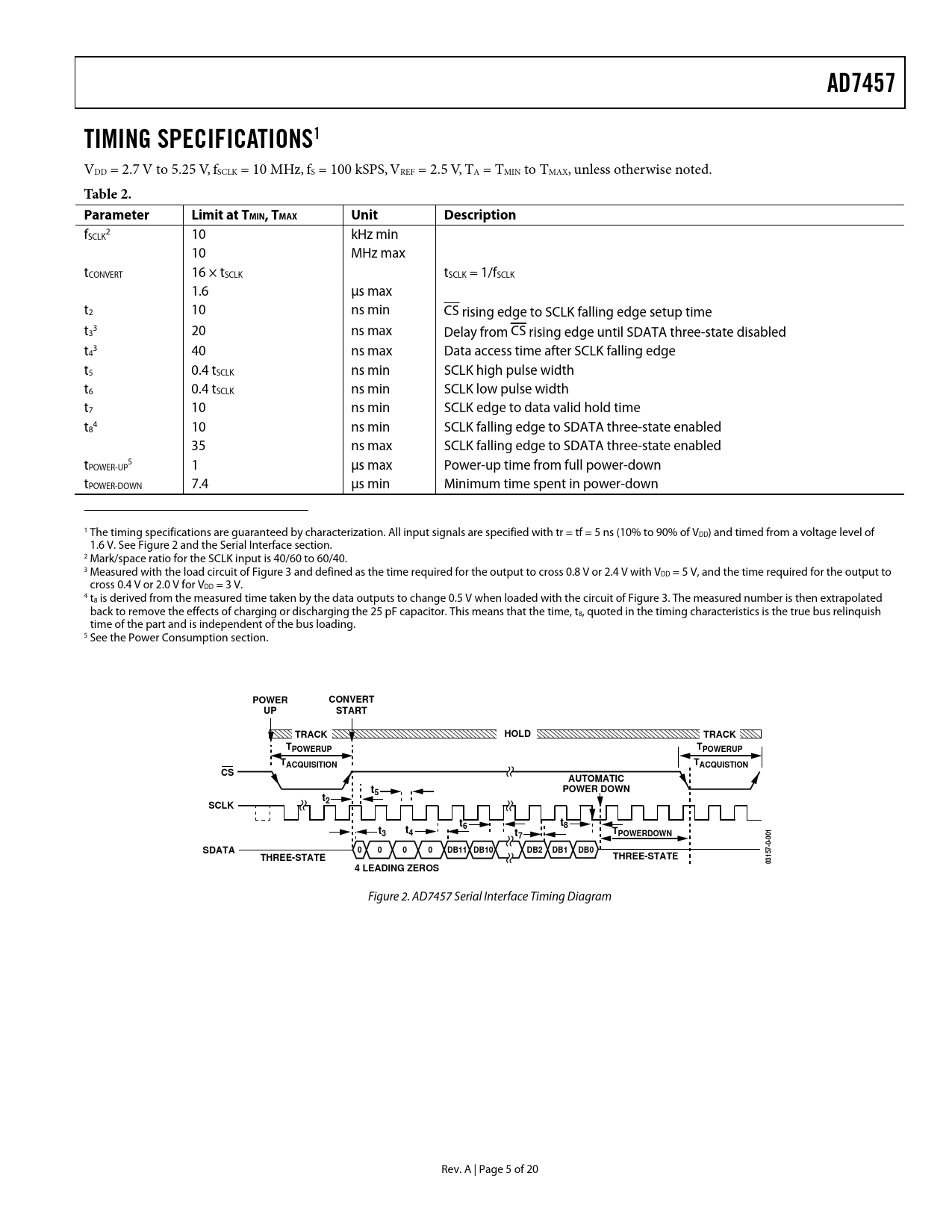 AD7457 TIMING SPECIFICATIONS1 Table 2 Parameter Limit at TMIN, TMAX Unit Description POWER CONVERT START TRACK HOLD TPOWERUP