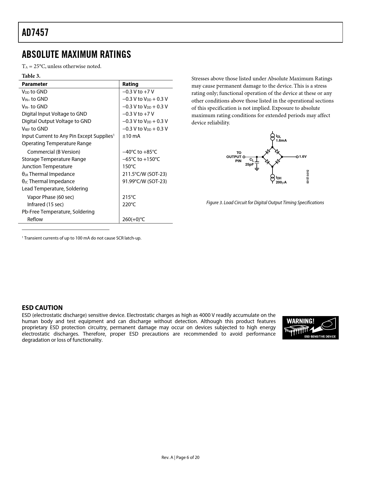 AD7457. ABSOLUTE MAXIMUM RATINGS. Table 3. Parameter Rating. IOL 1.6mA. 1.6V. OUTPUT. PIN. 25pF. IOH. 200. 03157-0-012. ESD CAUTION