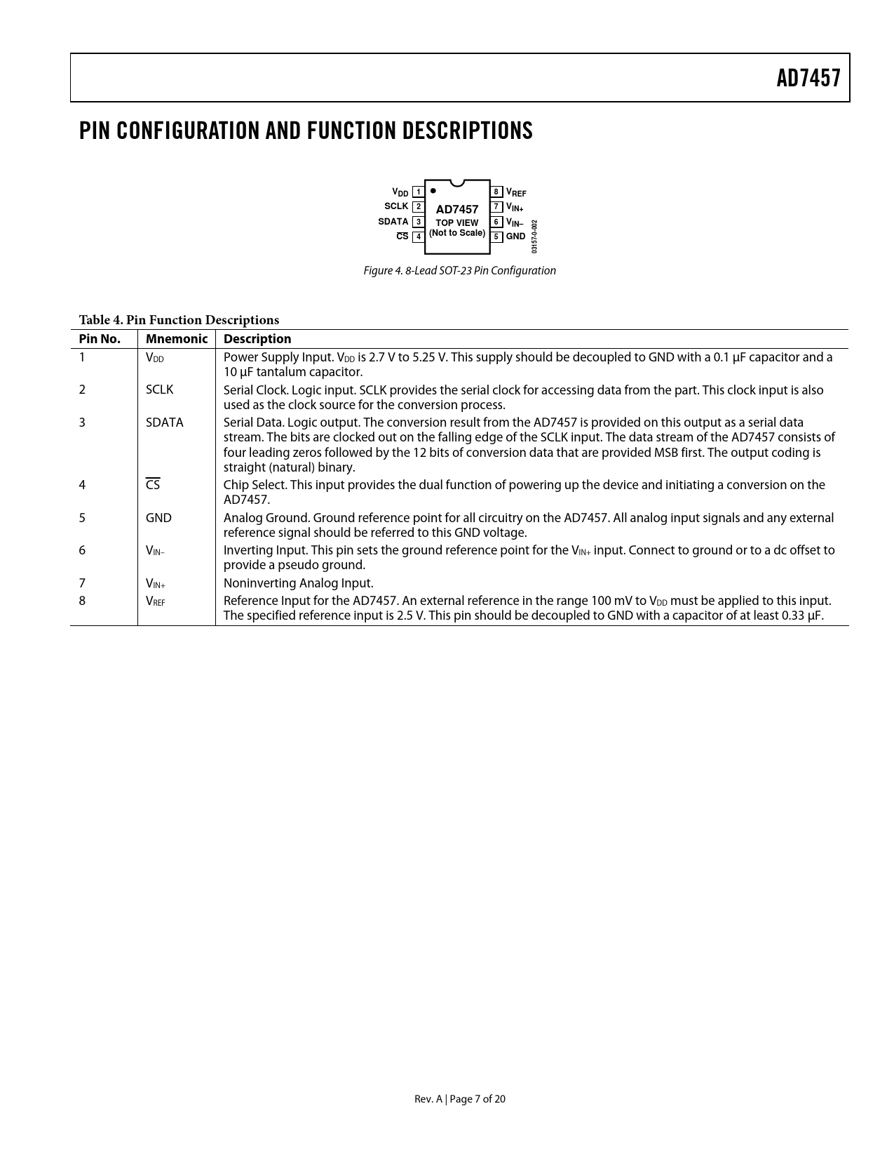 AD7457 PIN CONFIGURATION AND FUNCTION DESCRIPTIONS VDD 1 VREF SCLK VIN+ SDATA TOP VIEW VIN– (Not to Scale) GND 03157-0-002