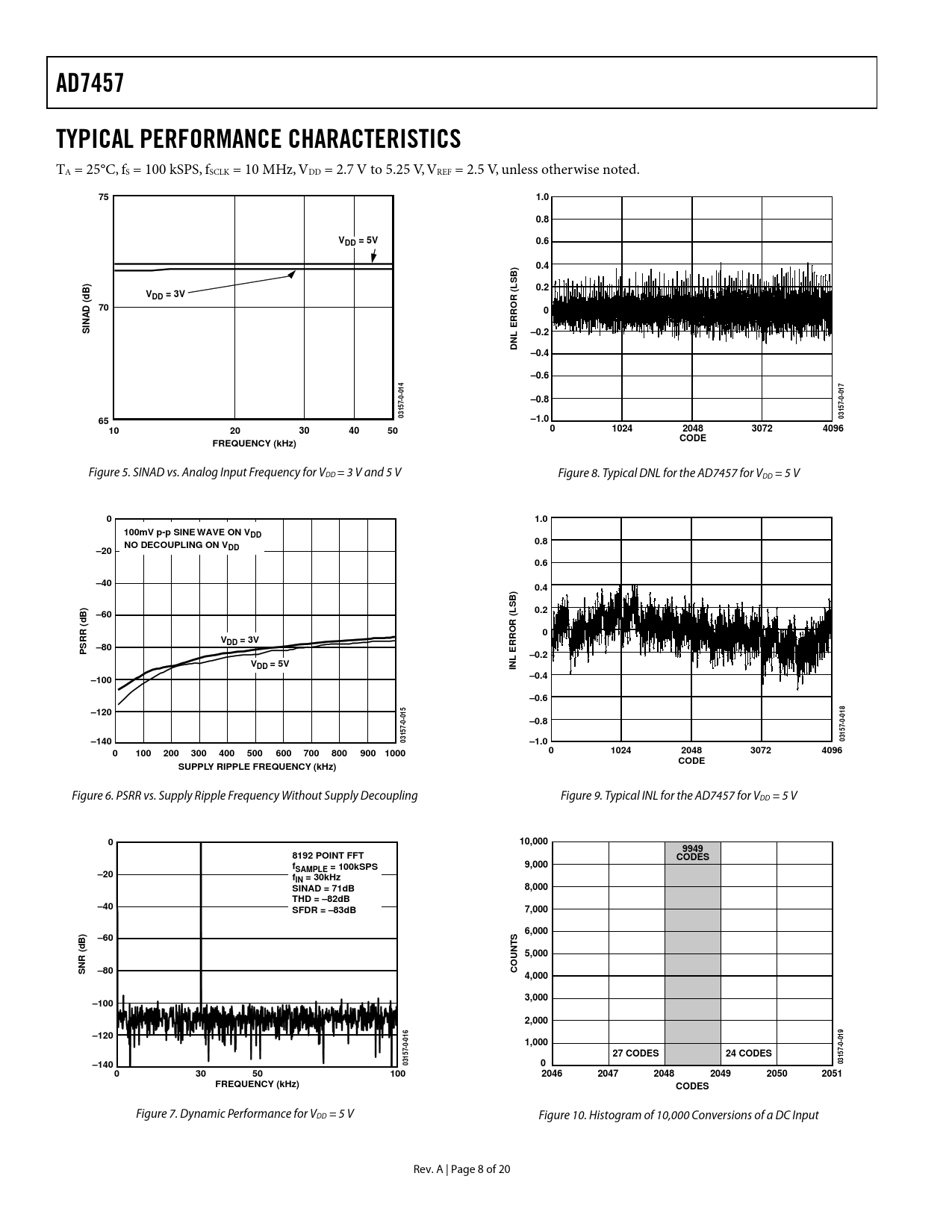 AD7457TYPICAL PERFORMANCE CHARACTERISTICS TA = 25°C, fS = 100 kSPS, fSCLK = 10 MHz, VDD = 2.7 V to 5.25 V, VREF = 2.5 V, unless otherwise noted. 751.00.8VDD = 5V0.6)0.4B0.2VDD = 3V700RROR (LSINAD (dB) S–0.2DNL E–0.4–0.6–0.803157-0-01403157-0-01765–1.0102030405001024204830724096CODEFREQUENCY (kHz) Figure 5. SINAD vs. Analog Input Frequency for VDD = 3 V and 5 V Figure 8. Typical DNL for the AD7457 for VDD = 5 V 01.0100mV p-p SINE WAVE ON VDD NO DECOUPLING ON V0.8–20DD0.6–40)0.4B0.2–600RR (dB)VSDD = 3V–80RROR (LSP–0.2VDD = 5VINL E–0.4–100–0.6–120–0.8–14003157-0-015–1.003157-0-0180100200300400500600700800900100001024204830724096CODESUPPLY RIPPLE FREQUENCY (kHz) Figure 6. PSRR vs. Supply Ripple Frequency Without Supply Decoupling Figure 9. Typical INL for the AD7457 for VDD = 5 V 010,00099498192 POINT FFTCODESf9,000SAMPLE = 100kSPS–20fIN = 30kHz SINAD = 71dB8,000THD = –82dB–40SFDR = –83dB7,0006,000–605,000NR (dB) S–80COUNTS 4,0003,000–1002,000–1201,00027 CODES24 CODES–14003157-0-016003157-0-01903050100204620472048204920502051FREQUENCY (kHz)CODES Figure 7. Dynamic Performance for VDD = 5 V Figure 10. Histogram of 10,000 Conversions of a DC Input Rev. A | Page 8 of 20 Document Outline FEATURES APPLICATIONS GENERAL DESCRIPTION PRODUCT HIGHLIGHTS SPECIFICATIONS TIMING SPECIFICATIONS ABSOLUTE MAXIMUM RATINGS ESD CAUTION PIN CONFIGURATION AND FUNCTION DESCRIPTIONS TYPICAL PERFORMANCE CHARACTERISTICS TERMINOLOGY THEORY OF OPERATION CIRCUIT INFORMATION CONVERTER OPERATION ADC TRANSFER FUNCTION TYPICAL CONNECTION DIAGRAM ANALOG INPUT ANALOG INPUT STRUCTURE DIGITAL INPUTS REFERENCE SECTION SERIAL INTERFACE POWER CONSUMPTION MICROPROCESSOR INTERFACING AD7457 to ADSP-218x APPLICATION HINTS GROUNDING AND LAYOUT OUTLINE DIMENSIONS ORDERING GUIDE