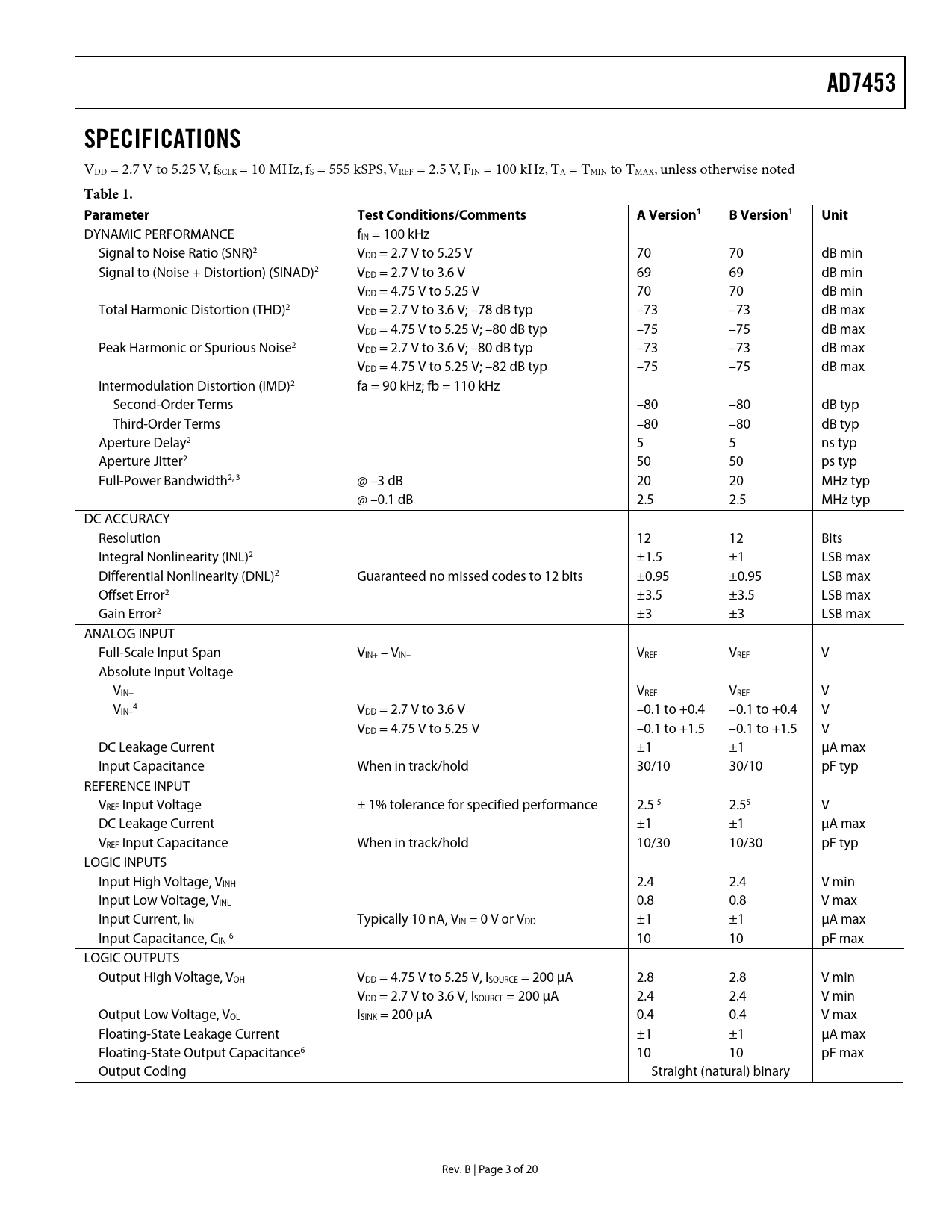 link to page 4 link to page 4 link to page 4 link to page 4 link to page 4 link to page 4 link to page 4 link to page 4 link to page 4 link to page 4 link to page 4 link to page 4 link to page 4 link to page 4 link to page 5 link to page 5 link to page 5 link to page 5 link to page 5 link to page 5 AD7453SPECIFICATIONS VDD = 2.7 V to 5.25 V, fSCLK = 10 MHz, fS = 555 kSPS, VREF = 2.5 V, FIN = 100 kHz, TA = TMIN to TMAX, unless otherwise noted Table 1. ParameterTest Conditions/CommentsA Version1B Version 1 Unit DYNAMIC PERFORMANCE fIN = 100 kHz Signal to Noise Ratio (SNR)2 VDD = 2.7 V to 5.25 V 70 70 dB min Signal to (Noise + Distortion) (SINAD)2 VDD = 2.7 V to 3.6 V 69 69 dB min VDD = 4.75 V to 5.25 V 70 70 dB min Total Harmonic Distortion (THD)2 VDD = 2.7 V to 3.6 V; –78 dB typ –73 –73 dB max VDD = 4.75 V to 5.25 V; –80 dB typ –75 –75 dB max Peak Harmonic or Spurious Noise2 VDD = 2.7 V to 3.6 V; –80 dB typ –73 –73 dB max VDD = 4.75 V to 5.25 V; –82 dB typ –75 –75 dB max Intermodulation Distortion (IMD)2 fa = 90 kHz; fb = 110 kHz Second-Order Terms –80 –80 dB typ Third-Order Terms –80 –80 dB typ Aperture Delay2 5 5 ns typ Aperture Jitter2 50 50 ps typ Full-Power Bandwidth2, 3 @ –3 dB 20 20 MHz typ @ –0.1 dB 2.5 2.5 MHz typ DC ACCURACY Resolution 12 12 Bits Integral Nonlinearity (INL)2 ±1.5 ±1 LSB max Differential Nonlinearity (DNL)2 Guaranteed no missed codes to 12 bits ±0.95 ±0.95 LSB max Offset Error2 ±3.5 ±3.5 LSB max Gain Error2 ±3 ±3 LSB max ANALOG INPUT Full-Scale Input Span VIN+ – VIN– VREF VREF V Absolute Input Voltage VIN+ VREF VREF V V 4 IN– VDD = 2.7 V to 3.6 V –0.1 to +0.4 –0.1 to +0.4 V VDD = 4.75 V to 5.25 V –0.1 to +1.5 –0.1 to +1.5 V DC Leakage Current ±1 ±1 µA max Input Capacitance When in track/hold 30/10 30/10 pF typ REFERENCE INPUT VREF Input Voltage ± 1% tolerance for specified performance 2.5 5 2.55 V DC Leakage Current ±1 ±1 µA max VREF Input Capacitance When in track/hold 10/30 10/30 pF typ LOGIC INPUTS Input High Voltage, VINH 2.4 2.4 V min Input Low Voltage, VINL 0.8 0.8 V max Input Current, IIN Typically 10 nA, VIN = 0 V or VDD ±1 ±1 µA max Input Capacitance, CIN 6 10 10 pF max LOGIC OUTPUTS Output High Voltage, VOH VDD = 4.75 V to 5.25 V, ISOURCE = 200 µA 2.8 2.8 V min VDD = 2.7 V to 3.6 V, ISOURCE = 200 µA 2.4 2.4 V min Output Low Voltage, VOL ISINK = 200 µA 0.4 0.4 V max Floating-State Leakage Current ±1 ±1 µA max Floating-State Output Capacitance6 10 10 pF max Output Coding Straight (natural) binary Rev. B | Page 3 of 20 Document Outline FEATURES APPLICATIONS GENERAL DESCRIPTION FUNCTIONAL BLOCK DIAGRAM PRODUCT HIGHLIGHTS SPECIFICATIONS TIMING SPECIFICATIONS ABSOLUTE MAXIMUM RATINGS ESD CAUTION PIN CONFIGURATION AND FUNCTION DESCRIPTIONS TERMINOLOGY AD7453–TYPICAL PERFORMANCE CHARACTERISTICS CIRCUIT INFORMATION CONVERTER OPERATION ADC TRANSFER FUNCTION TYPICAL CONNECTION DIAGRAM THE ANALOG INPUT Analog Input Structure DIGITAL INPUTS REFERENCE SERIAL INTERFACE Timing Example 1 MODES OF OPERATION NORMAL MODE POWER-DOWN MODE POWER-UP TIME POWER VS. THROUGHPUT RATE MICROPROCESSOR AND DSP INTERFACING AD7453 to ADSP-21xx AD7453 to TMS320C5x/C54x AD7453 to DSP56xxx APPLICATION HINTS Grounding and Layout EVALUATING THE AD7453’S PERFORMANCE OUTLINE DIMENSIONS ORDERING GUIDE