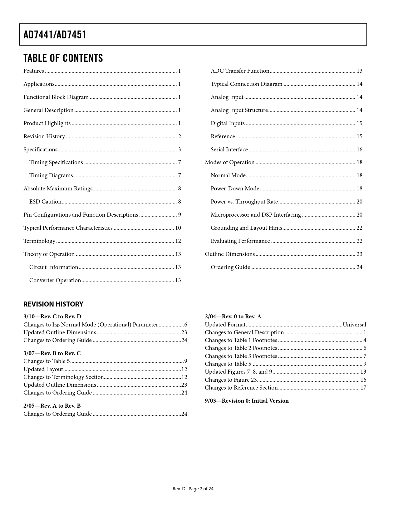 Seiten / Seite24 / 2 — AD7441/AD7451. TABLE OF CONTENTS. REVISION HISTORY. 3/10—Rev. C to Rev. …