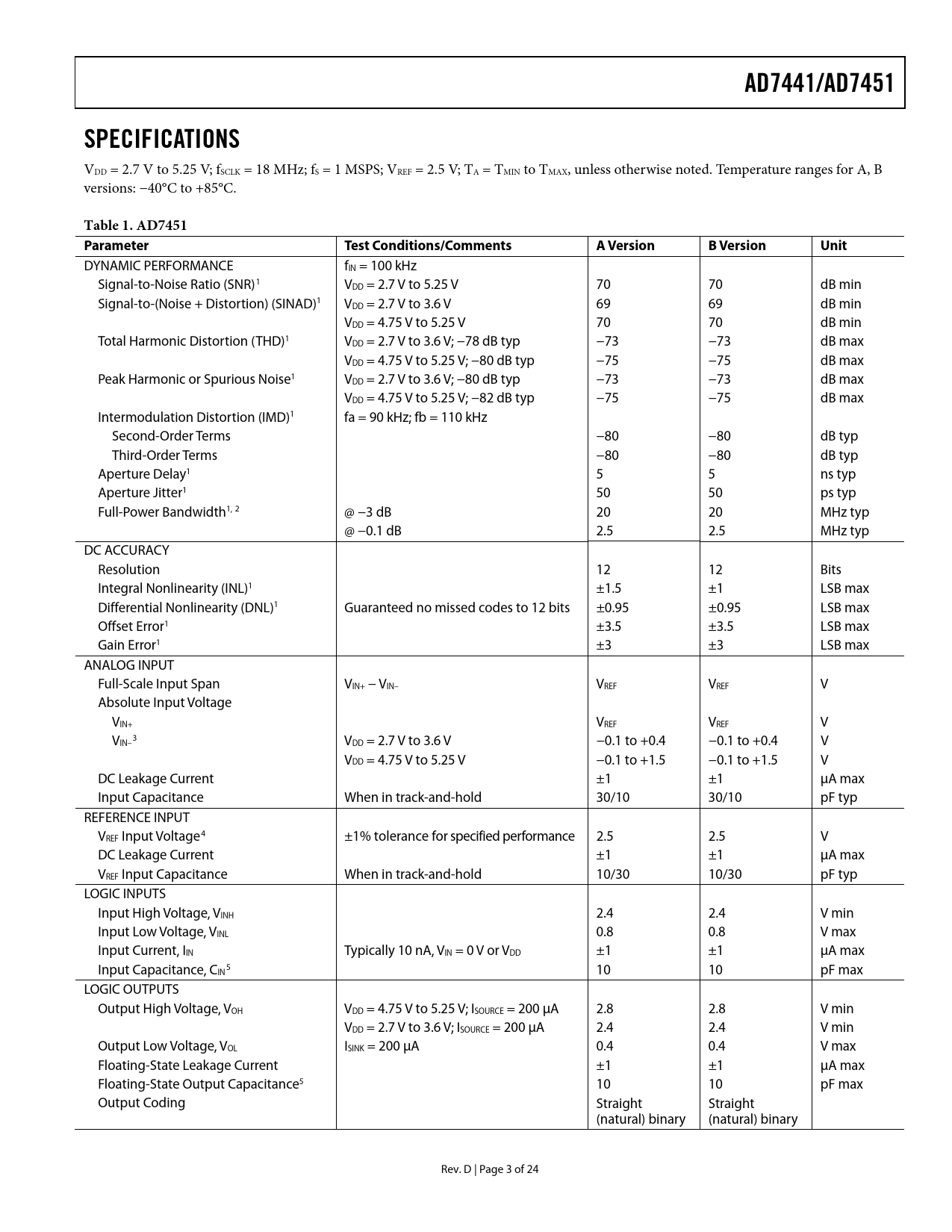 AD7441/AD7451. SPECIFICATIONS. Table 1. AD7451 Parameter. Test Conditions/Comments. A Version. B Version. Unit