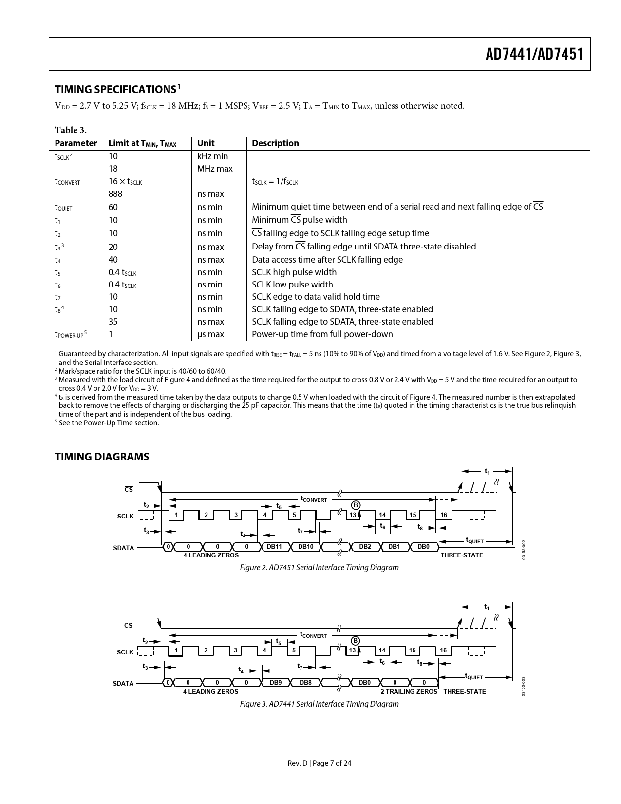 Seiten / Seite24 / 7 — AD7441/AD7451. TIMING SPECIFICATIONS1. Table 3. Parameter Limit at TMIN, …