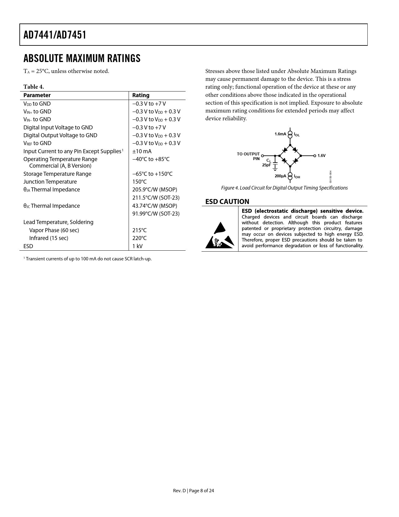 AD7441/AD7451. ABSOLUTE MAXIMUM RATINGS. Table 4. Parameter Rating. 1.6mA. TO OUTPUT. 1.6V. PIN. 25pF. 200µA. ESD CAUTION