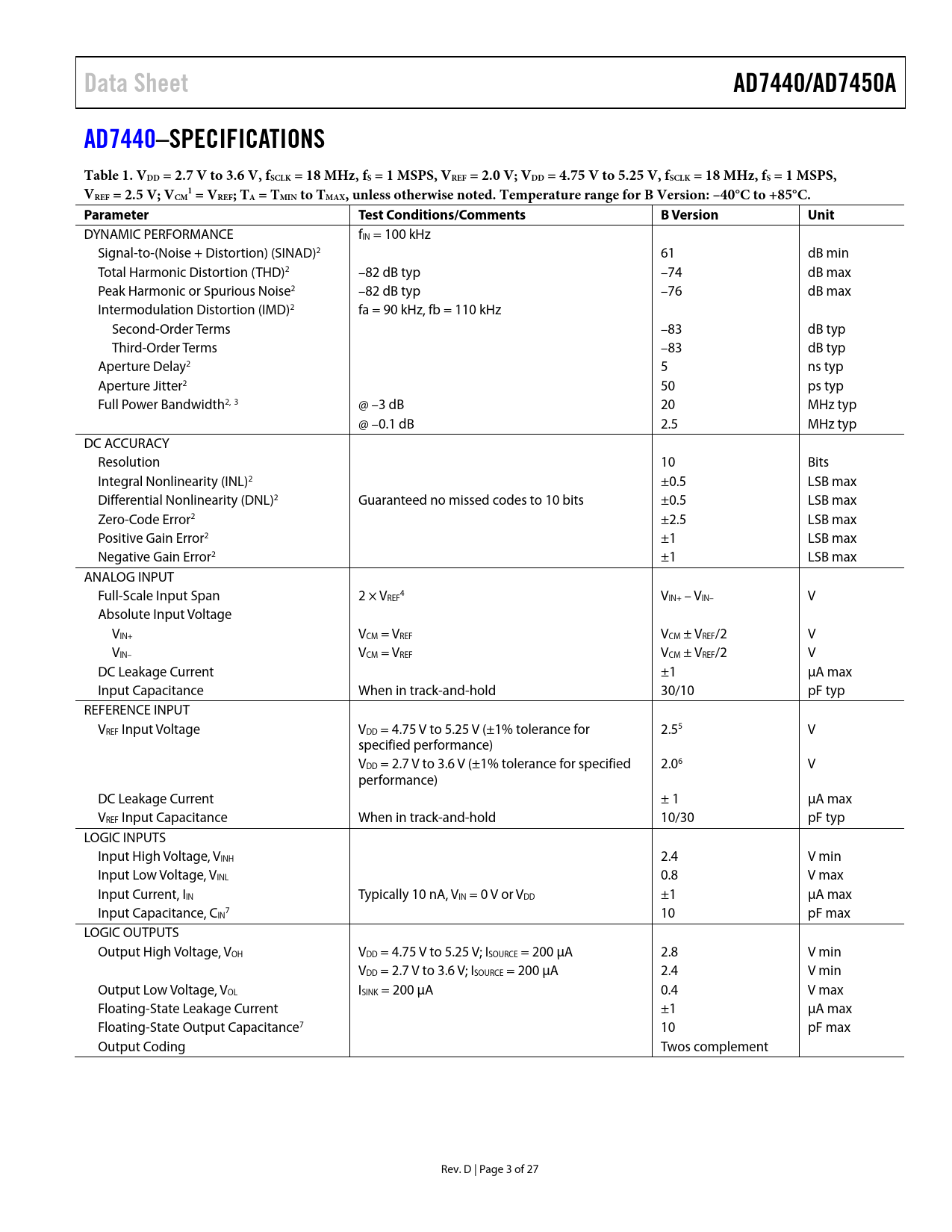Data Sheet AD7440/AD7450A AD7440–SPECIFICA TIONS Table 1. VDD = 2.7 V to 3.6 V, fSCLK = 18 MHz, fS = 1 MSPS, VREF = 2.0 V; VDD = 4.75 V to 5.25 V, fSCLK = 18 MHz, fS = 1 MSPS, V 1 REF = 2.5 V; VCM = VREF; TA = TMIN to TMAX, unless otherwise noted. Temperature range for B Version: –40°C to +85°C. Parameter Test Conditions/Comments B Version Unit