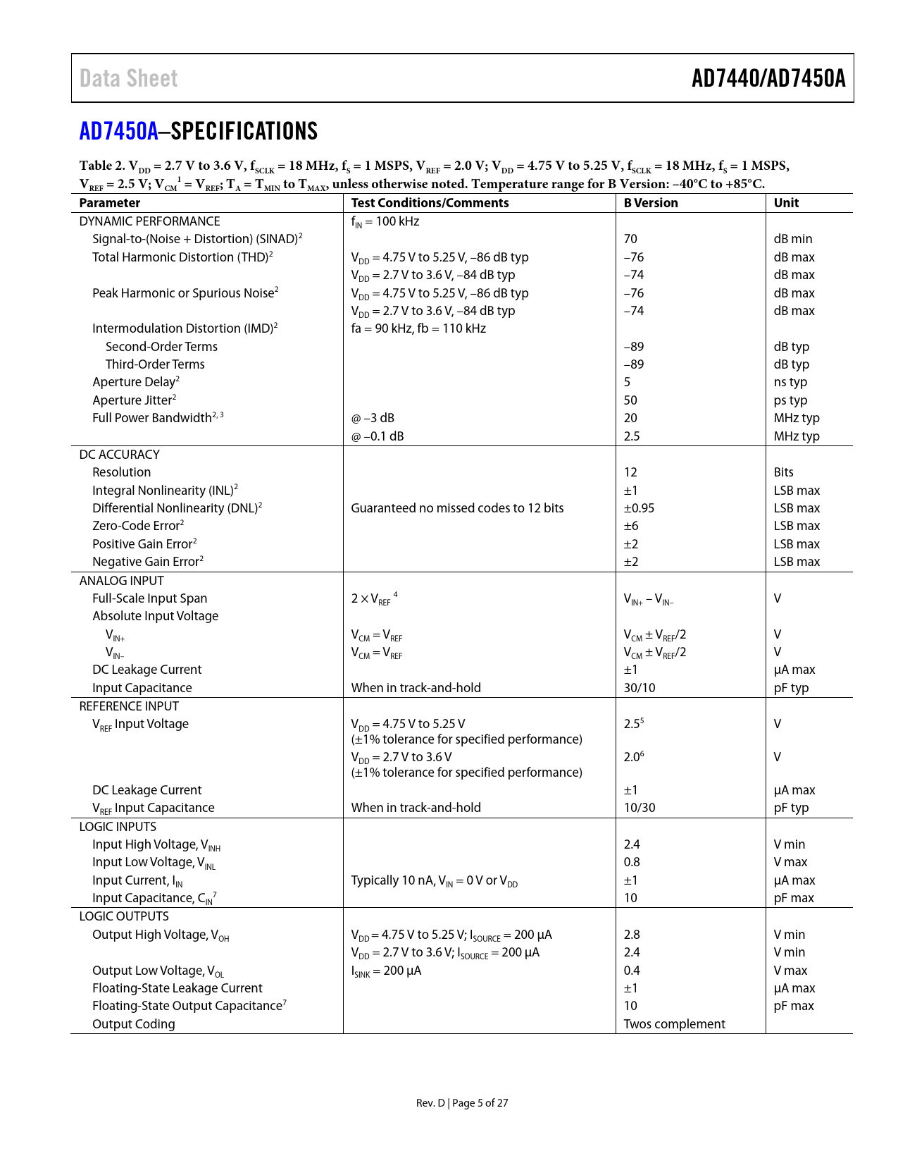 Data Sheet AD7440/AD7450A AD7450A– SPECIFICATIONS Table 2. VDD = 2.7 V to 3.6 V, fSCLK = 18 MHz, fS = 1 MSPS, VREF = 2.0 V; VDD = 4.75 V to 5.25 V, fSCLK = 18 MHz, fS = 1 MSPS, V 1 REF = 2.5 V; VCM = VREF; TA = TMIN to TMAX, unless otherwise noted. Temperature range for B Version: –40°C to +85°C. Parameter Test Conditions/Comments B Version Unit