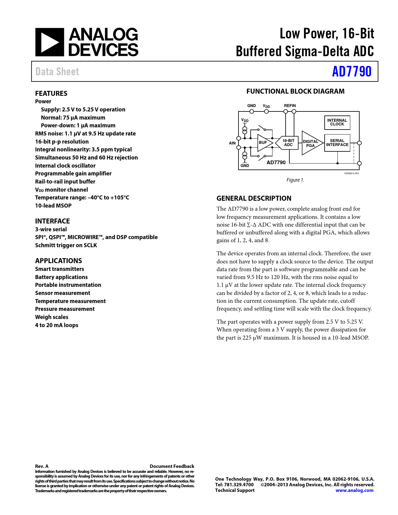 Low Power, 16-Bit. Buffered Sigma-Delta ADC. Data Sheet. AD7790. FEATURES. FUNCTIONAL BLOCK DIAGRAM. Power. GND. REFIN