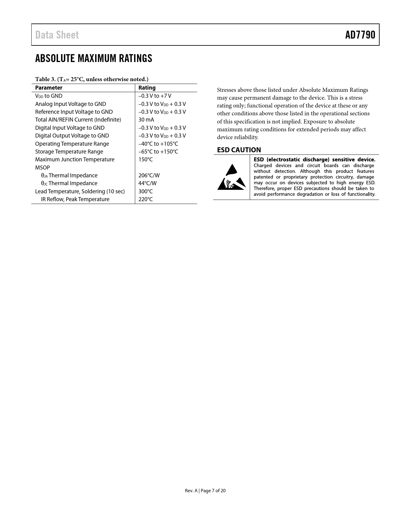 Data Sheet AD7790 ABSOLUTE MAXIMUM RATINGS Table 3 (TA= 25°C, unless otherwise noted.) Parameter Rating ESD CAUTION