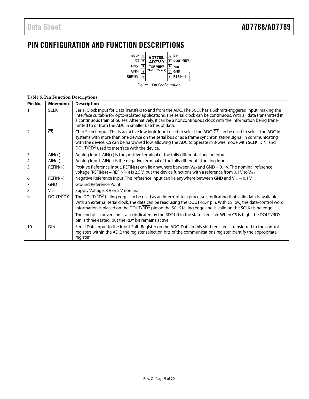 Data Sheet. AD7788/AD7789. PIN CONFIGURATION AND FUNCTION DESCRIPTIONS. SCLK. 10 DIN. AD7788/. AD7789. DOUT/RDY. AIN(+). TOP VIEW. VDD