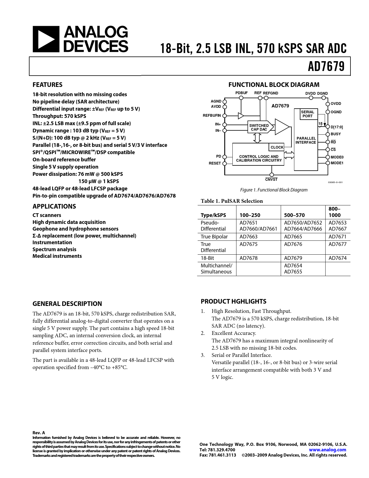 18-Bit, 2.5 LSB INL, 570 kSPS SAR ADC. AD7679. FEATURES. FUNCTIONAL BLOCK DIAGRAM. 18-bit resolution with no missing codes. PDBUF
