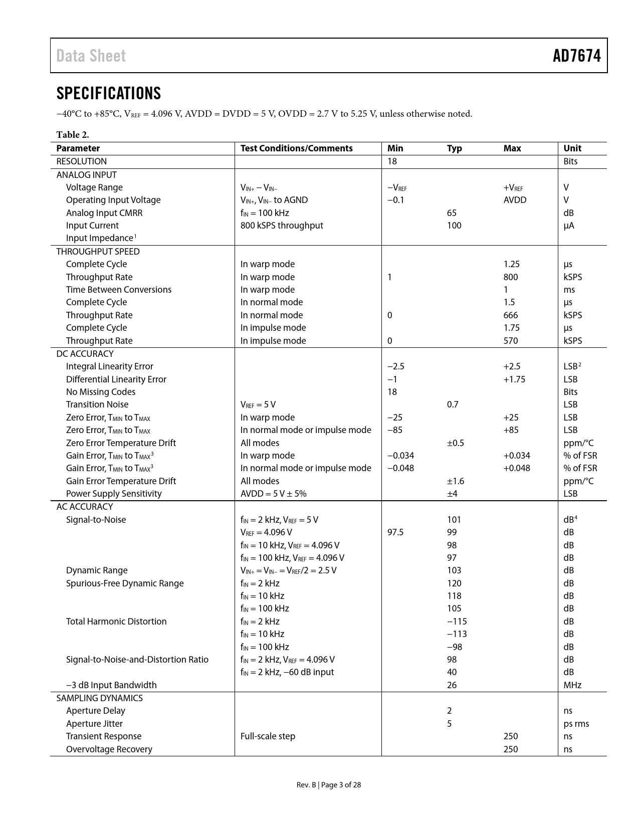 link to page 6 link to page 5 link to page 5 link to page 5 link to page 5 Data SheetAD7674SPECIFICATIONS −40°C to +85°C, VREF = 4.096 V, AVDD = DVDD = 5 V, OVDD = 2.7 V to 5.25 V, unless otherwise noted. Table 2. ParameterTest Conditions/CommentsMinTypMaxUnit RESOLUTION 18 Bits ANALOG INPUT Voltage Range VIN+ − VIN− −VREF +VREF V Operating Input Voltage VIN+, VIN− to AGND −0.1 AVDD V Analog Input CMRR fIN = 100 kHz 65 dB Input Current 800 kSPS throughput 100 µA Input Impedance1 THROUGHPUT SPEED Complete Cycle In warp mode 1.25 µs Throughput Rate In warp mode 1 800 kSPS Time Between Conversions In warp mode 1 ms Complete Cycle In normal mode 1.5 µs Throughput Rate In normal mode 0 666 kSPS Complete Cycle In impulse mode 1.75 µs Throughput Rate In impulse mode 0 570 kSPS DC ACCURACY Integral Linearity Error −2.5 +2.5 LSB2 Differential Linearity Error −1 +1.75 LSB No Missing Codes 18 Bits Transition Noise VREF = 5 V 0.7 LSB Zero Error, TMIN to TMAX In warp mode −25 +25 LSB Zero Error, TMIN to TMAX In normal mode or impulse mode −85 +85 LSB Zero Error Temperature Drift All modes ±0.5 ppm/°C Gain Error, T 3 MIN to TMAX In warp mode −0.034 +0.034 % of FSR Gain Error, T 3 MIN to TMAX In normal mode or impulse mode −0.048 +0.048 % of FSR Gain Error Temperature Drift All modes ±1.6 ppm/°C Power Supply Sensitivity AVDD = 5 V ± 5% ±4 LSB AC ACCURACY Signal-to-Noise fIN = 2 kHz, VREF = 5 V 101 dB4 VREF = 4.096 V 97.5 99 dB fIN = 10 kHz, VREF = 4.096 V 98 dB fIN = 100 kHz, VREF = 4.096 V 97 dB Dynamic Range VIN+ = VIN− = VREF/2 = 2.5 V 103 dB Spurious-Free Dynamic Range fIN = 2 kHz 120 dB fIN = 10 kHz 118 dB fIN = 100 kHz 105 dB Total Harmonic Distortion fIN = 2 kHz −115 dB fIN = 10 kHz −113 dB fIN = 100 kHz −98 dB Signal-to-Noise-and-Distortion Ratio fIN = 2 kHz, VREF = 4.096 V 98 dB fIN = 2 kHz, −60 dB input 40 dB −3 dB Input Bandwidth 26 MHz SAMPLING DYNAMICS Aperture Delay 2 ns Aperture Jitter 5 ps rms Transient Response Full-scale step 250 ns Overvoltage Recovery 250 ns Rev. B | Page 3 of 28 Document Outline FEATURES APPLICATIONS GENERAL DESCRIPTION FUNCTIONAL BLOCK DIAGRAM PRODUCT HIGHLIGHTS TABLE OF CONTENTS REVISION HISTORY SPECIFICATIONS TIMING SPECIFICATIONS ABSOLUTE MAXIMUM RATINGS ESD CAUTION PIN CONFIGURATION AND FUNCTION DESCRIPTIONS TERMINOLOGY TYPICAL PERFORMANCE CHARACTERISTICS CIRCUIT INFORMATION CONVERTER OPERATION Modes of Operation Transfer Functions TYPICAL CONNECTION DIAGRAM Analog Inputs Driver Amplifier Choice Single-to-Differential Driver Voltage Reference Power Supply POWER DISSIPATION VERSUS THROUGHPUT CONVERSION CONTROL DIGITAL INTERFACE PARALLEL INTERFACE SERIAL INTERFACE MASTER SERIAL INTERFACE Internal Clock SLAVE SERIAL INTERFACE External Clock External Discontinuous Clock Data Read after Conversion External Clock Data Read during Conversion MICROPROCESSOR INTERFACING Serial Peripheral Interface (SPI) APPLICATIONS INFORMATION LAYOUT EVALUATING AD7674 PERFORMANCE OUTLINE DIMENSIONS ORDERING GUIDE NOTES NOTES