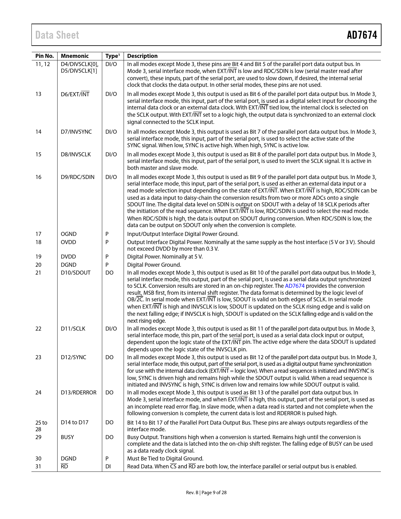 Data Sheet AD7674 Pin No Mnemonic Type1 Description