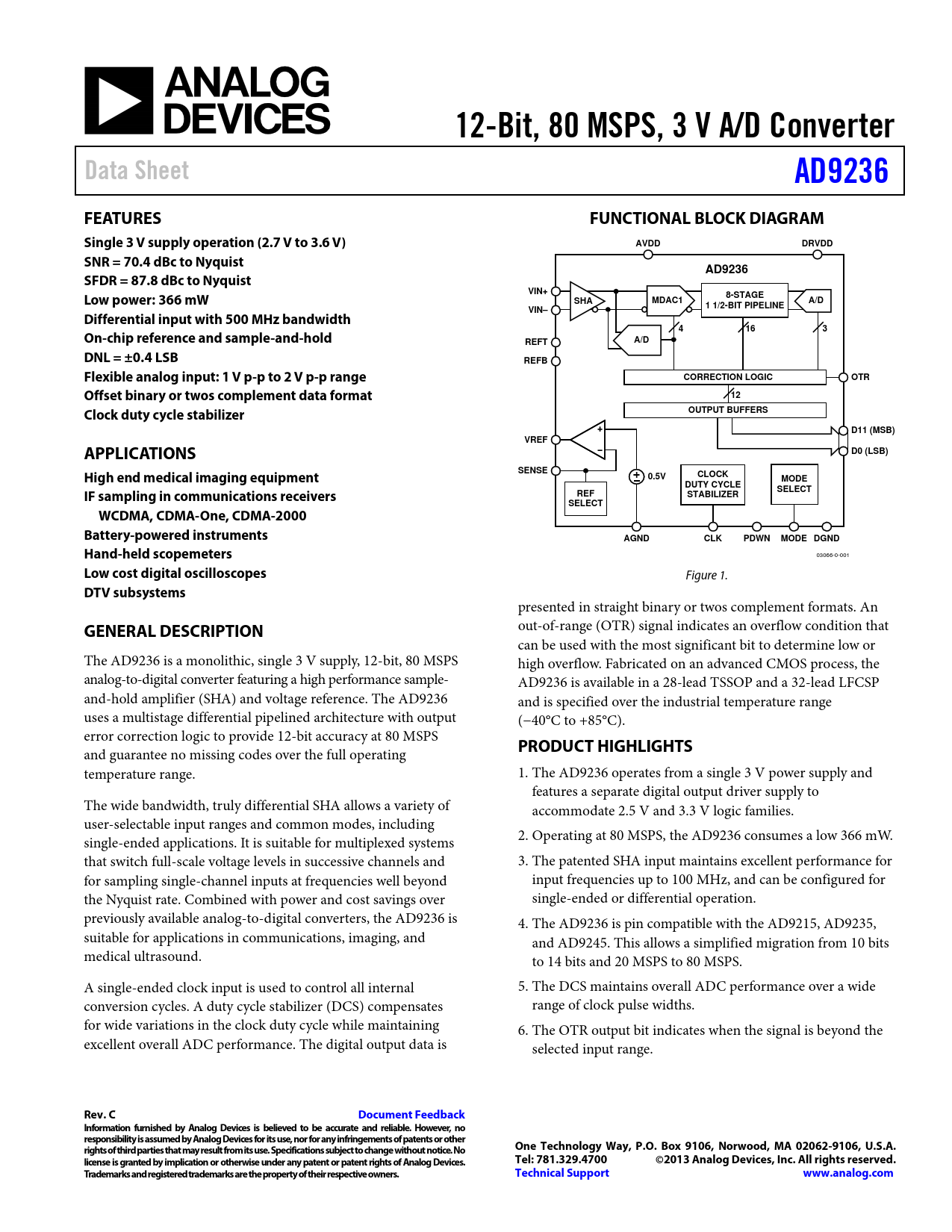 and guarantee no missing codes over the full operating temperature range. 1. The AD9236 operates from a single 3 V power supply and features a separate digital output driver supply to The wide bandwidth, truly differential SHA al ows a variety of accommodate 2.5 V and 3.3 V logic families. user-selectable input ranges and common modes, including single-ended applications. It is suitable for multiplexed systems 2. Operating at 80 MSPS, the AD9236 consumes a low 366 mW. that switch ful -scale voltage levels in successive channels and 3. The patented SHA input maintains excellent performance for for sampling single-channel inputs at frequencies well beyond input frequencies up to 100 MHz, and can be configured for the Nyquist rate. Combined with power and cost savings over single-ended or differential operation. previously available analog-to-digital converters, the AD9236 is 4. The AD9236 is pin compatible with the AD9215, AD9235, suitable for applications in communications, imaging, and and AD9245. This allows a simplified migration from 10 bits medical ultrasound. to 14 bits and 20 MSPS to 80 MSPS. A single-ended clock input is used to control all internal 5. The DCS maintains overal ADC performance over a wide conversion cycles. A duty cycle stabilizer (DCS) compensates range of clock pulse widths. for wide variations in the clock duty cycle while maintaining 6. The OTR output bit indicates when the signal is beyond the excellent overall ADC performance. The digital output data is selected input range.