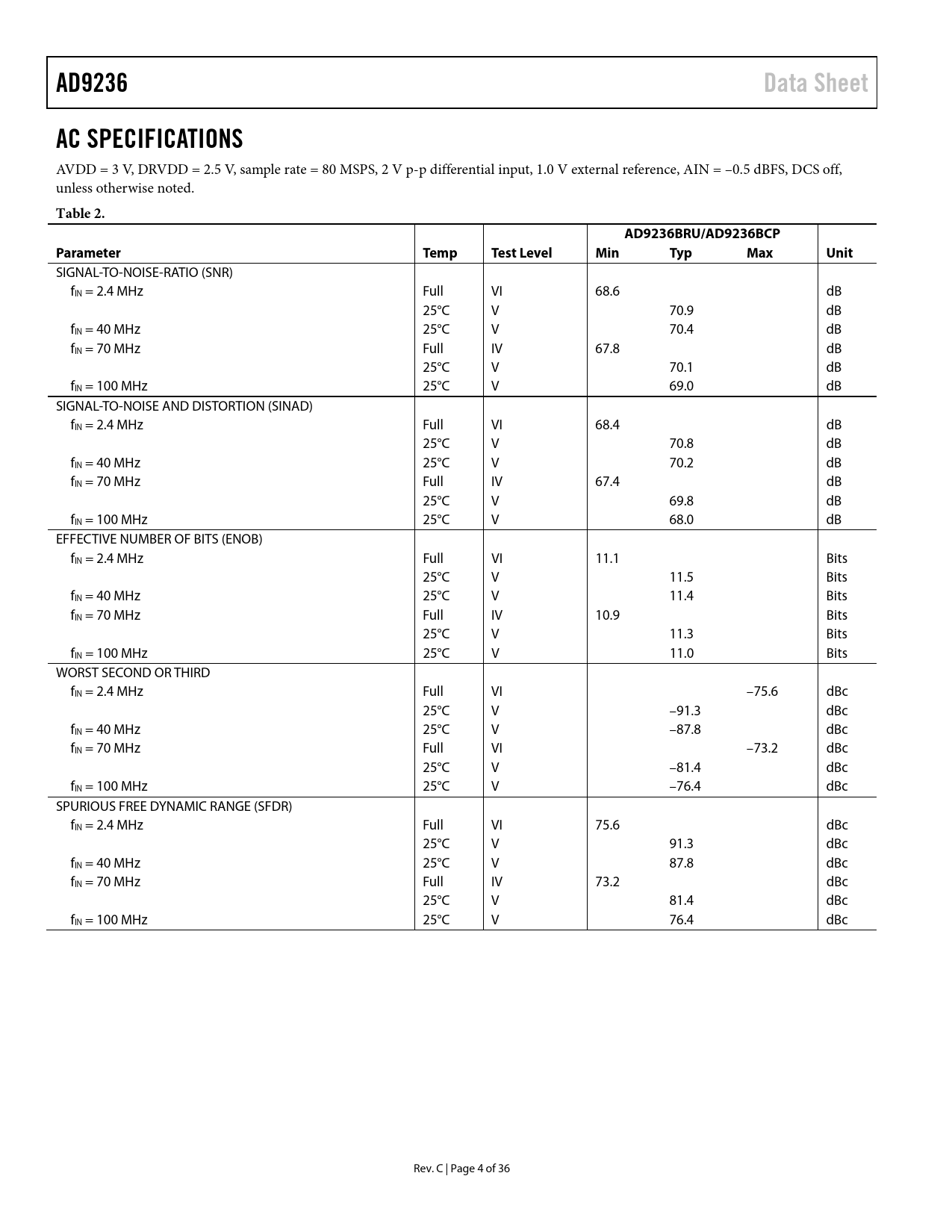 AD9236Data SheetAC SPECIFICATIONS AVDD = 3 V, DRVDD = 2.5 V, sample rate = 80 MSPS, 2 V p-p differential input, 1.0 V external reference, AIN = –0.5 dBFS, DCS off, unless otherwise noted. Table 2.AD9236BRU/AD9236BCPParameterTempTest LevelMinTypMaxUnit SIGNAL-TO-NOISE-RATIO (SNR) fIN = 2.4 MHz Full VI 68.6 dB 25°C V 70.9 dB fIN = 40 MHz 25°C V 70.4 dB fIN = 70 MHz Full IV 67.8 dB 25°C V 70.1 dB fIN = 100 MHz 25°C V 69.0 dB SIGNAL-TO-NOISE AND DISTORTION (SINAD) fIN = 2.4 MHz Full VI 68.4 dB 25°C V 70.8 dB fIN = 40 MHz 25°C V 70.2 dB fIN = 70 MHz Full IV 67.4 dB 25°C V 69.8 dB fIN = 100 MHz 25°C V 68.0 dB EFFECTIVE NUMBER OF BITS (ENOB) fIN = 2.4 MHz Full VI 11.1 Bits 25°C V 11.5 Bits fIN = 40 MHz 25°C V 11.4 Bits fIN = 70 MHz Full IV 10.9 Bits 25°C V 11.3 Bits fIN = 100 MHz 25°C V 11.0 Bits WORST SECOND OR THIRD fIN = 2.4 MHz Full VI –75.6 dBc 25°C V –91.3 dBc fIN = 40 MHz 25°C V –87.8 dBc fIN = 70 MHz Full VI –73.2 dBc 25°C V –81.4 dBc fIN = 100 MHz 25°C V –76.4 dBc SPURIOUS FREE DYNAMIC RANGE (SFDR) fIN = 2.4 MHz Full VI 75.6 dBc 25°C V 91.3 dBc fIN = 40 MHz 25°C V 87.8 dBc fIN = 70 MHz Full IV 73.2 dBc 25°C V 81.4 dBc fIN = 100 MHz 25°C V 76.4 dBc Rev. C | Page 4 of 36 Document Outline Features Applications General Description Functional Block Diagram Product Highlights Revision History DC Specifications AC Specifications Digital Specifications Switching Specifications Absolute Maximum Ratings Thermal Resistance ESD Caution Terminology Pin Configurations and Function Descriptions Equivalent Circuits Typical Performance Characteristics Theory of Operation Analog Input and Reference Overview Differential Input Configurations Single-Ended Input Configuration Clock Input Considerations Jitter Considerations Power Dissipation and Standby Mode Digital Outputs Timing Voltage Reference Internal Reference Connection External Reference Operation Operational Mode Selection Evaluation Board TSSOP Evaluation Board LFCSP Evaluation Board Outline Dimensions Ordering Guide