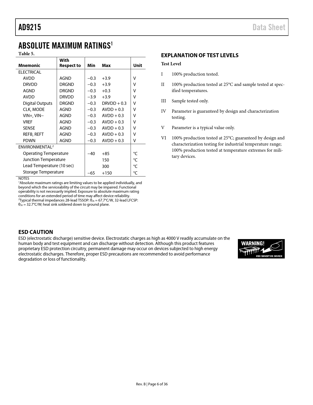 link to page 7 link to page 7 AD9215Data SheetABSOLUTE MAXIMUM RATINGS1Table 5.EXPLANATION OF TEST LEVELSWithMnemonicRespect toMinMaxUnitTest Level ELECTRICAL I 100% production tested. AVDD AGND −0.3 +3.9 V DRVDD DRGND −0.3 +3.9 V II 100% production tested at 25°C and sample tested at spec- AGND DRGND −0.3 +0.3 V ified temperatures. AVDD DRVDD −3.9 +3.9 V Digital Outputs DRGND −0.3 DRVDD + 0.3 V III Sample tested only. CLK, MODE AGND −0.3 AVDD + 0.3 V IV Parameter is guaranteed by design and characterization VIN+, VIN− AGND −0.3 AVDD + 0.3 V testing. VREF AGND −0.3 AVDD + 0.3 V SENSE AGND −0.3 AVDD + 0.3 V V Parameter is a typical value only. REFB, REFT AGND −0.3 AVDD + 0.3 V PDWN AGND −0.3 AVDD + 0.3 V VI 100% production tested at 25°C; guaranteed by design and characterization testing for industrial temperature range; ENVIRONMENTAL2 100% production tested at temperature extremes for mili- Operating Temperature −40 +85 °C tary devices. Junction Temperature 150 °C Lead Temperature (10 sec) 300 °C Storage Temperature −65 +150 °C NOTES 1Absolute maximum ratings are limiting values to be applied individually, and beyond which the serviceability of the circuit may be impaired. Functional operability is not necessarily implied. Exposure to absolute maximum rating conditions for an extended period of time may affect device reliability. 2Typical thermal impedances 28-lead TSSOP: θJA = 67.7°C/W, 32-lead LFCSP: θJA = 32.7°C/W; heat sink soldered down to ground plane. ESD CAUTION ESD (electrostatic discharge) sensitive device. Electrostatic charges as high as 4000 V readily accumulate on the human body and test equipment and can discharge without detection. Although this product features proprietary ESD protection circuitry, permanent damage may occur on devices subjected to high energy electrostatic discharges. Therefore, proper ESD precautions are recommended to avoid performance degradation or loss of functionality. Rev. B | Page 6 of 36 Document Outline Specifications Absolute Maximum Ratings1 Explanation of Test Levels ESD Caution Pin Configurations and Function Descriptions Equivalent Circuits Definitions of Specifications Aperture Delay Aperture Jitter Clock Pulse Width and Duty Cycle Differential Nonlinearity (DNL, No Missing Codes) Effective Number of Bits (ENOB) Gain Error Integral Nonlinearity (INL) Maximum Conversion Rate Minimum Conversion Rate Offset Error Out-of-Range Recovery Time Output Propagation Delay Power Supply Rejection Signal-to-Noise and Distortion (SINAD) Ratio Signal-to-Noise Ratio (SNR) Spurious-Free Dynamic Range (SFDR) Temperature Drift Total Harmonic Distortion (THD) Two-Tone SFDR Typical Performance Characteristics Applying the AD9215 Theory of Operation Analog Input and Reference Overview Differential Input Configurations Single-Ended Input Configuration Clock Input and Considerations Power Dissipation and Standby Mode Digital Outputs Timing Voltage Reference Internal Reference Connection External Reference Operation Operational Mode Selection Evaluation Board Outline Dimensions Ordering Guide
