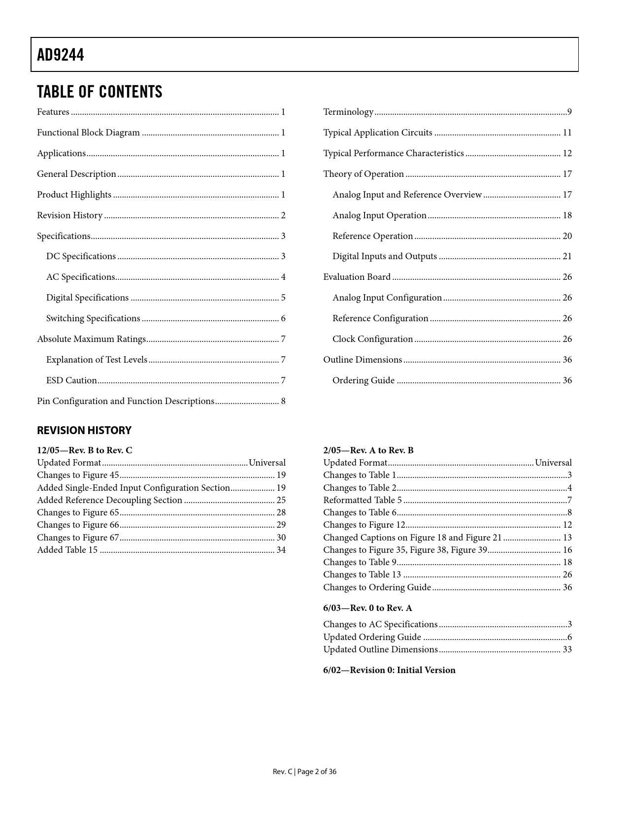 link to page 1 link to page 1 link to page 1 link to page 1 link to page 1 link to page 1 link to page 1 link to page 1 link to page 1 link to page 1 link to page 3 link to page 3 link to page 4 link to page 4 link to page 4 link to page 4 link to page 5 link to page 5 link to page 6 link to page 6 link to page 7 link to page 7 link to page 8 link to page 8 link to page 8 link to page 8 link to page 8 link to page 8 link to page 9 link to page 9 link to page 10 link to page 10 link to page 12 link to page 12 link to page 13 link to page 13 link to page 18 link to page 18 link to page 18 link to page 18 link to page 19 link to page 19 link to page 21 link to page 21 link to page 22 link to page 22 link to page 27 link to page 27 link to page 27 link to page 27 link to page 27 link to page 27 link to page 27 link to page 27 link to page 37 link to page 37 link to page 37 link to page 37 AD9244TABLE OF CONTENTS Features .. 1 Terminology ...9 Functional Block Diagram .. 1 Typical Application Circuits ... 11 Applications... 1 Typical Performance Characteristics ... 12 General Description ... 1 Theory of Operation .. 17 Product Highlights ... 1 Analog Input and Reference Overview ... 17 Revision History ... 2 Analog Input Operation .. 18 Specifications... 3 Reference Operation .. 20 DC Specifications ... 3 Digital Inputs and Outputs ... 21 AC Specifications.. 4 Evaluation Board .. 26 Digital Specifications ... 5 Analog Input Configuration ... 26 Switching Specifications .. 6 Reference Configuration ... 26 Absolute Maximum Ratings.. 7 Clock Configuration .. 26 Explanation of Test Levels ... 7 Outline Dimensions ... 36 ESD Caution.. 7 Ordering Guide .. 36 Pin Configuration and Function Descriptions... 8 REVISION HISTORY12/05—Rev. B to Rev. C2/05—Rev. A to Rev. B Updated Format..Universal Updated Format..Universal Changes to Figure 45.. 19 Changes to Table 1...3 Added Single-Ended Input Configuration Section.. 19 Changes to Table 2...4 Added Reference Decoupling Section ... 25 Reformatted Table 5 ..7 Changes to Figure 65.. 28 Changes to Table 6...8 Changes to Figure 66.. 29 Changes to Figure 12.. 12 Changes to Figure 67.. 30 Changed Captions on Figure 18 and Figure 21 .. 13 Added Table 15 ... 34 Changes to Figure 35, Figure 38, Figure 39... 16 Changes to Table 9.. 18 Changes to Table 13 ... 26 Changes to Ordering Guide .. 36 6/03—Rev. 0 to Rev. A Changes to AC Specifications ..3 Updated Ordering Guide ...6 Updated Outline Dimensions... 33 6/02—Revision 0: Initial Version Rev. C | Page 2 of 36 Document Outline FEATURES APPLICATIONS GENERAL DESCRIPTION FUNCTIONAL BLOCK DIAGRAM PRODUCT HIGHLIGHTS TABLE OF CONTENTS REVISION HISTORY SPECIFICATIONS DC SPECIFICATIONS AC SPECIFICATIONS DIGITAL SPECIFICATIONS SWITCHING SPECIFICATIONS ABSOLUTE MAXIMUM RATINGS EXPLANATION OF TEST LEVELS ESD CAUTION PIN CONFIGURATION AND FUNCTION DESCRIPTIONS TERMINOLOGY TYPICAL APPLICATION CIRCUITS TYPICAL PERFORMANCE CHARACTERISTICS THEORY OF OPERATION ANALOG INPUT AND REFERENCE OVERVIEW ANALOG INPUT OPERATION Single-Ended Input Configuration Differentially Driving the Analog Inputs REFERENCE OPERATION Pin-Programmable Reference Resistor-Programmable Reference Using an External Reference Digital Outputs Data Format Select (DFS) Digital Output Driver Considerations DIGITAL INPUTS AND OUTPUTS Out of Range (OTR) Digital Output Enable Function (OEB) Clock Overview Clock Input Modes Clock Input Considerations Clock Power Dissipation Clock Stabilizer (DCS) Grounding and Decoupling Analog and Digital Grounding Analog Supply Decoupling Digital Supply Decoupling Reference Decoupling CML VR EVALUATION BOARD ANALOG INPUT CONFIGURATION REFERENCE CONFIGURATION CLOCK CONFIGURATION OUTLINE DIMENSIONS ORDERING GUIDE