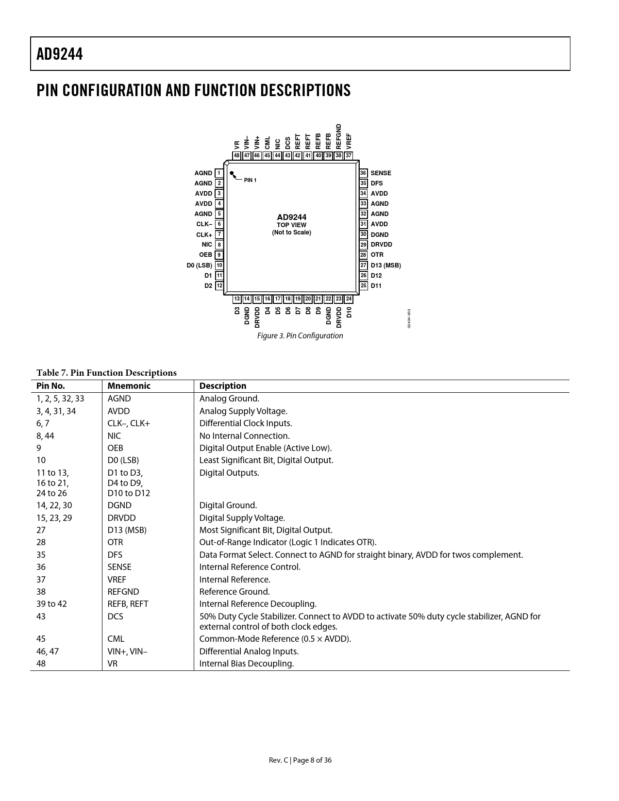AD9244 PIN CONFIGURATION AND FUNCTION DESCRIPTIONS FGND VIN CML NIC DCS 48 47 46 45 44 43 42 41 40 39 38 37 AGND 1 SENSE PIN 1 AGND