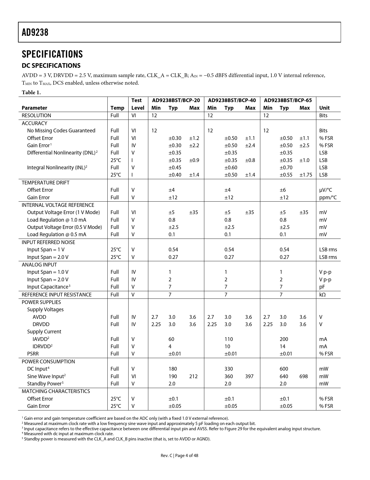 link to page 5 link to page 5 link to page 5 link to page 5 link to page 5 link to page 5 link to page 5 link to page 5 link to page 5 link to page 16 AD9238SPECIFICATIONS DC SPECIFICATIONS AVDD = 3 V, DRVDD = 2.5 V, maximum sample rate, CLK_A = CLK_B; AIN = −0.5 dBFS differential input, 1.0 V internal reference, TMIN to TMAX, DCS enabled, unless otherwise noted. Table 1.TestAD9238BST/BCP-20AD9238BST/BCP-40AD9238BST/BCP-65ParameterTempLevelMinTypMaxMinTypMaxMinTypMaxUnit RESOLUTION Full VI 12 12 12 Bits ACCURACY No Missing Codes Guaranteed Full VI 12 12 12 Bits Offset Error Full VI ±0.30 ±1.2 ±0.50 ±1.1 ±0.50 ±1.1 % FSR Gain Error1 Full IV ±0.30 ±2.2 ±0.50 ±2.4 ±0.50 ±2.5 % FSR Differential Nonlinearity (DNL)2 Full V ±0.35 ±0.35 ±0.35 LSB 25°C I ±0.35 ±0.9 ±0.35 ±0.8 ±0.35 ±1.0 LSB Integral Nonlinearity (INL)2 Full V ±0.45 ±0.60 ±0.70 LSB 25°C I ±0.40 ±1.4 ±0.50 ±1.4 ±0.55 ±1.75 LSB TEMPERATURE DRIFT Offset Error Full V ±4 ±4 ±6 μV/°C Gain Error Full V ±12 ±12 ±12 ppm/°C INTERNAL VOLTAGE REFERENCE Output Voltage Error (1 V Mode) Full VI ±5 ±35 ±5 ±35 ±5 ±35 mV Load Regulation @ 1.0 mA Full V 0.8 0.8 0.8 mV Output Voltage Error (0.5 V Mode) Full V ±2.5 ±2.5 ±2.5 mV Load Regulation @ 0.5 mA Full V 0.1 0.1 0.1 mV INPUT REFERRED NOISE Input Span = 1 V 25°C V 0.54 0.54 0.54 LSB rms Input Span = 2.0 V 25°C V 0.27 0.27 0.27 LSB rms ANALOG INPUT Input Span = 1.0 V Full IV 1 1 1 V p-p Input Span = 2.0 V Full IV 2 2 2 V p-p Input Capacitance3 Full V 7 7 7 pF REFERENCE INPUT RESISTANCE Full V 7 7 7 kΩ POWER SUPPLIES Supply Voltages AVDD Full IV 2.7 3.0 3.6 2.7 3.0 3.6 2.7 3.0 3.6 V DRVDD Full IV 2.25 3.0 3.6 2.25 3.0 3.6 2.25 3.0 3.6 V Supply Current IAVDD2 Full V 60 110 200 mA IDRVDD2 Full V 4 10 14 mA PSRR Full V ±0.01 ±0.01 ±0.01 % FSR POWER CONSUMPTION DC Input4 Full V 180 330 600 mW Sine Wave Input2 Full VI 190 212 360 397 640 698 mW Standby Power5 Full V 2.0 2.0 2.0 mW MATCHING CHARACTERISTICS Offset Error 25°C V ±0.1 ±0.1 ±0.1 % FSR Gain Error 25°C V ±0.05 ±0.05 ±0.05 % FSR 1 Gain error and gain temperature coefficient are based on the ADC only (with a fixed 1.0 V external reference). 2 Measured at maximum clock rate with a low frequency sine wave input and approximately 5 pF loading on each output bit. 3 Input capacitance refers to the effective capacitance between one differential input pin and AVSS. Refer to Figure 2 f 9 or the equivalent analog input structure. 4 Measured with dc input at maximum clock rate. 5 Standby power is measured with the CLK_A and CLK_B pins inactive (that is, set to AVDD or AGND). Rev. C | Page 4 of 48 Document Outline FEATURES APPLICATIONS GENERAL DESCRIPTION FUNCTIONAL BLOCK DIAGRAM PRODUCT HIGHLIGHTS TABLE OF CONTENTS REVISION HISTORY SPECIFICATIONS DC SPECIFICATIONS AC SPECIFICATIONS DIGITAL SPECIFICATIONS SWITCHING SPECIFICATIONS ABSOLUTE MAXIMUM RATINGS EXPLANATION OF TEST LEVELS ESD CAUTION PIN CONFIGURATION AND FUNCTION DESCRIPTIONS TERMINOLOGY TYPICAL PERFORMANCE CHARACTERISTICS EQUIVALENT CIRCUITS THEORY OF OPERATION ANALOG INPUT Differential Input Configurations Single-Ended Input Configuration CLOCK INPUT AND CONSIDERATIONS POWER DISSIPATION AND STANDBY MODE DIGITAL OUTPUTS TIMING DATA FORMAT VOLTAGE REFERENCE Internal Reference Connection External Reference Operation AD9238 LQFP EVALUATION BOARD CLOCK CIRCUITRY ANALOG INPUTS REFERENCE CIRCUITRY DIGITAL CONTROL LOGIC OUTPUTS LQFP EVALUATION BOARD BILL OF MATERIALS (BOM) LQFP EVALUATION BOARD SCHEMATICS LQFP PCB LAYERS DUAL ADC LFCSP PCB POWER CONNECTOR ANALOG INPUTS OPTIONAL OPERATIONAL AMPLIFIER CLOCK VOLTAGE REFERENCE DATA OUTPUTS LFCSP EVALUATION BOARD BILL OF MATERIALS (BOM) LFCSP PCB SCHEMATICS LFCSP PCB LAYERS THERMAL CONSIDERATIONS OUTLINE DIMENSIONS ORDERING GUIDE