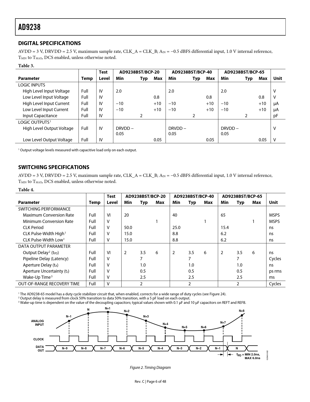 link to page 7 link to page 7 link to page 7 link to page 7 link to page 7 link to page 15 AD9238DIGITAL SPECIFICATIONS AVDD = 3 V, DRVDD = 2.5 V, maximum sample rate, CLK_A = CLK_B; AIN = −0.5 dBFS differential input, 1.0 V internal reference, TMIN to TMAX, DCS enabled, unless otherwise noted. Table 3.TestAD9238BST/BCP-20AD9238BST/BCP-40AD9238BST/BCP-65ParameterTempLevelMinTypMaxMinTypMaxMinTypMaxUnit LOGIC INPUTS High Level Input Voltage Full IV 2.0 2.0 2.0 V Low Level Input Voltage Full IV 0.8 0.8 0.8 V High Level Input Current Full IV −10 +10 −10 +10 −10 +10 μA Low Level Input Current Full IV −10 +10 −10 +10 −10 +10 μA Input Capacitance Full IV 2 2 2 pF LOGIC OUTPUTS1 High Level Output Voltage Full IV DRVDD − DRVDD − DRVDD − V 0.05 0.05 0.05 Low Level Output Voltage Full IV 0.05 0.05 0.05 V 1 Output voltage levels measured with capacitive load only on each output. SWITCHING SPECIFICATIONS AVDD = 3 V, DRVDD = 2.5 V, maximum sample rate, CLK_A = CLK_B; AIN = −0.5 dBFS differential input, 1.0 V internal reference, TMIN to TMAX, DCS enabled, unless otherwise noted. Table 4.TestAD9238BST/BCP-20AD9238BST/BCP-40AD9238BST/BCP-65ParameterTempLevelMinTypMaxMinTypMaxMinTypMaxUnit SWITCHING PERFORMANCE Maximum Conversion Rate Full VI 20 40 65 MSPS Minimum Conversion Rate Full V 1 1 1 MSPS CLK Period Full V 50.0 25.0 15.4 ns CLK Pulse-Width High1 Full V 15.0 8.8 6.2 ns CLK Pulse-Width Low1 Full V 15.0 8.8 6.2 ns DATA OUTPUT PARAMETER Output Delay2 (tPD) Full VI 2 3.5 6 2 3.5 6 2 3.5 6 ns Pipeline Delay (Latency) Full V 7 7 7 Cycles Aperture Delay (tA) Full V 1.0 1.0 1.0 ns Aperture Uncertainty (tJ) Full V 0.5 0.5 0.5 ps rms Wake-Up Time3 Full V 2.5 2.5 2.5 ms OUT-OF-RANGE RECOVERY TIME Full V 2 2 2 Cycles 1 The AD9238-65 model has a duty cycle stabilizer circuit that, when enabled, corrects for a wide range of duty cycles (see Figure 24). 2 Output delay is measured from clock 50% transition to data 50% transition, with a 5 pF load on each output. 3 Wake-up time is dependent on the value of the decoupling capacitors; typical values shown with 0.1 μF and 10 μF capacitors on REFT and REFB. NN+1N+2N+8N–1N+3ANALOGN+7N+4INPUTN+5N+6CLOCKDATAN–9N–8N–7N–6N–5N–4N–3N–2N–1NOUTtMIN 2.0ns,PD = MAX 6.0ns 02640-002 Figure 2. Timing Diagram Rev. C | Page 6 of 48 Document Outline FEATURES APPLICATIONS GENERAL DESCRIPTION FUNCTIONAL BLOCK DIAGRAM PRODUCT HIGHLIGHTS TABLE OF CONTENTS REVISION HISTORY SPECIFICATIONS DC SPECIFICATIONS AC SPECIFICATIONS DIGITAL SPECIFICATIONS SWITCHING SPECIFICATIONS ABSOLUTE MAXIMUM RATINGS EXPLANATION OF TEST LEVELS ESD CAUTION PIN CONFIGURATION AND FUNCTION DESCRIPTIONS TERMINOLOGY TYPICAL PERFORMANCE CHARACTERISTICS EQUIVALENT CIRCUITS THEORY OF OPERATION ANALOG INPUT Differential Input Configurations Single-Ended Input Configuration CLOCK INPUT AND CONSIDERATIONS POWER DISSIPATION AND STANDBY MODE DIGITAL OUTPUTS TIMING DATA FORMAT VOLTAGE REFERENCE Internal Reference Connection External Reference Operation AD9238 LQFP EVALUATION BOARD CLOCK CIRCUITRY ANALOG INPUTS REFERENCE CIRCUITRY DIGITAL CONTROL LOGIC OUTPUTS LQFP EVALUATION BOARD BILL OF MATERIALS (BOM) LQFP EVALUATION BOARD SCHEMATICS LQFP PCB LAYERS DUAL ADC LFCSP PCB POWER CONNECTOR ANALOG INPUTS OPTIONAL OPERATIONAL AMPLIFIER CLOCK VOLTAGE REFERENCE DATA OUTPUTS LFCSP EVALUATION BOARD BILL OF MATERIALS (BOM) LFCSP PCB SCHEMATICS LFCSP PCB LAYERS THERMAL CONSIDERATIONS OUTLINE DIMENSIONS ORDERING GUIDE