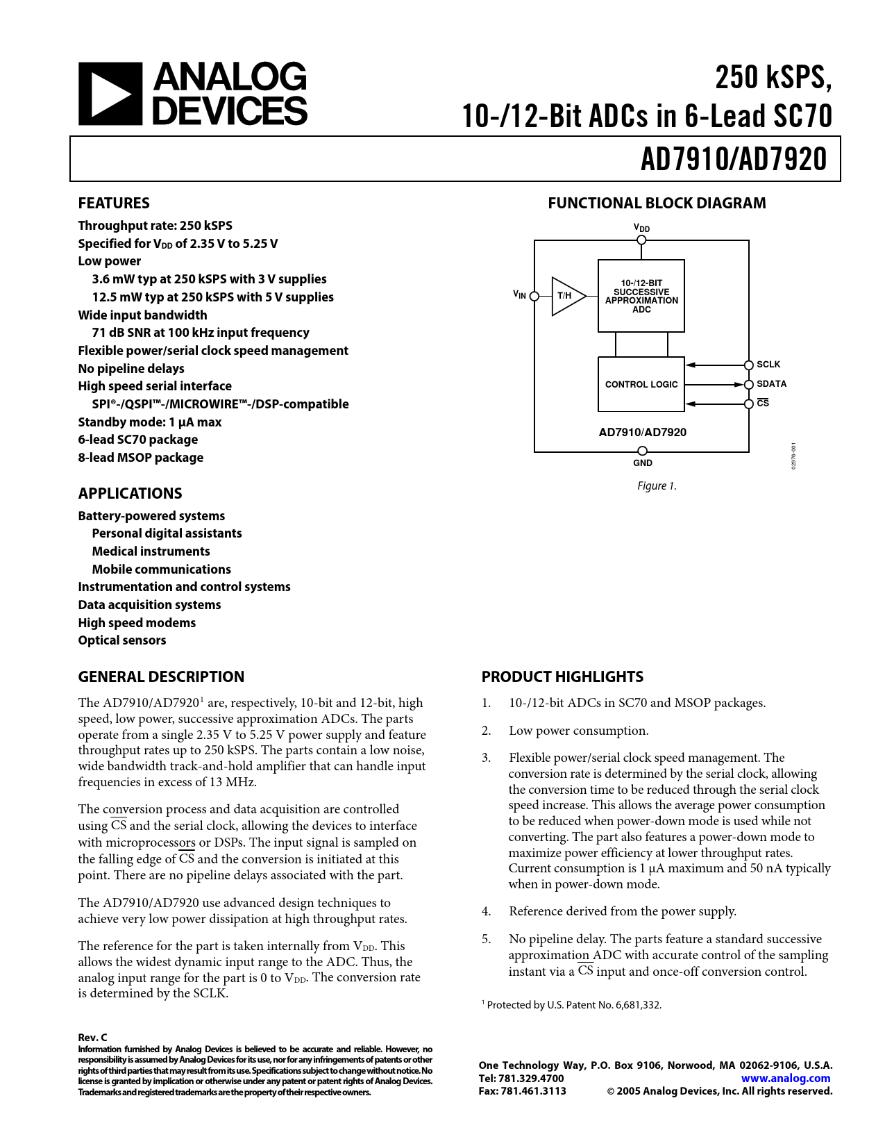 250 kSPS,. 10-/12-Bit ADCs in 6-Lead SC70. AD7910/AD7920. FEATURES. FUNCTIONAL BLOCK DIAGRAM. Throughput rate: 250 kSPS. VDD