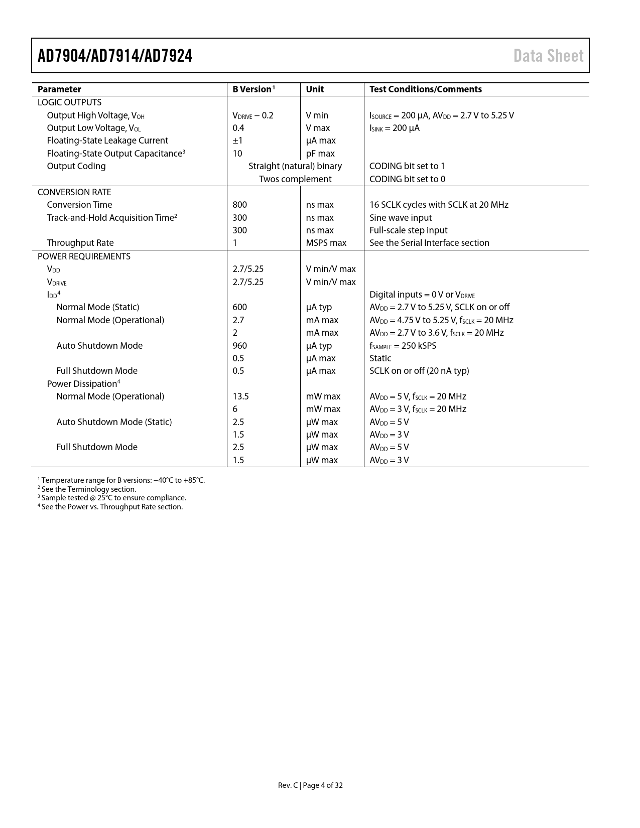 Seiten / Seite32 / 4 — AD7904/AD7914/AD7924. Data Sheet. Parameter. B Version1. Unit. Test …