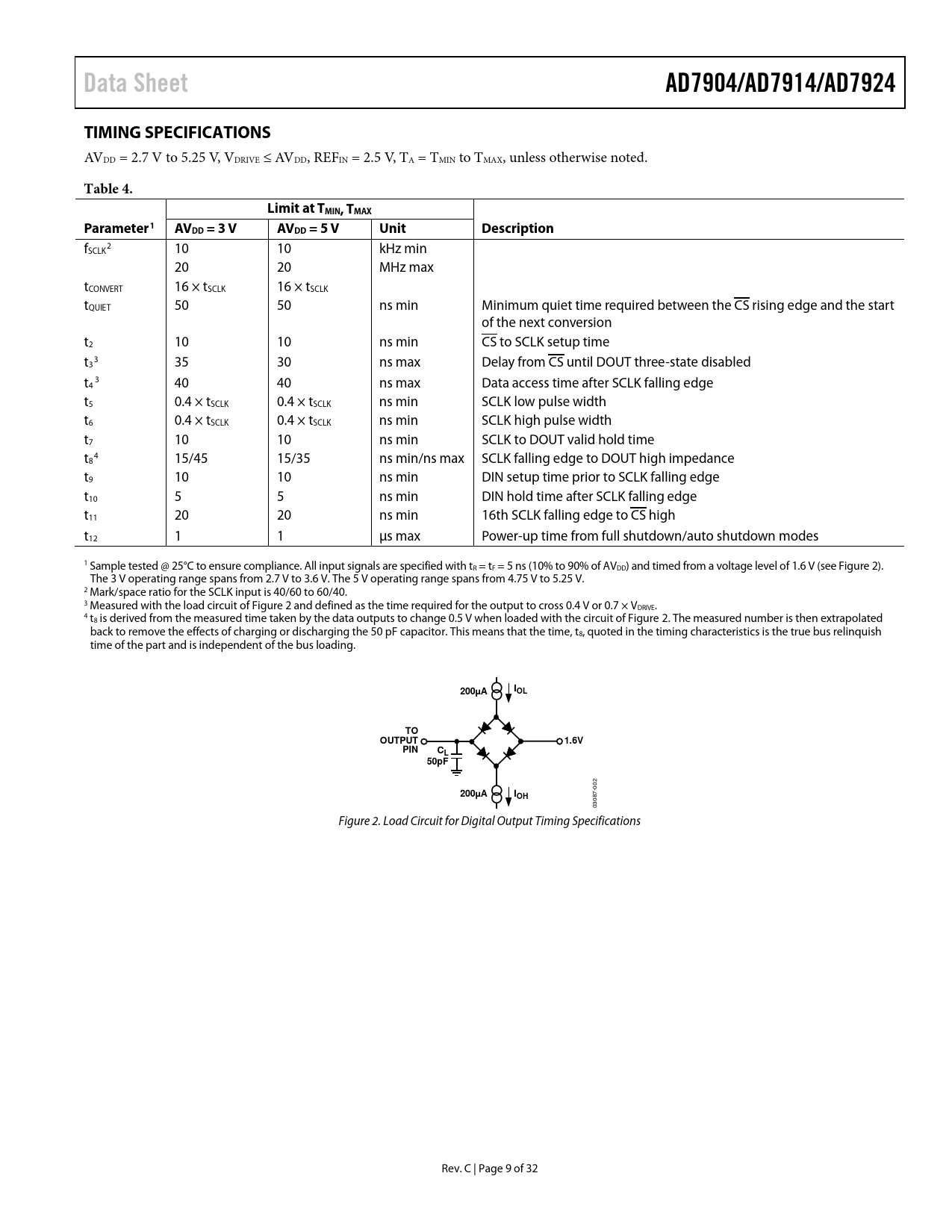 Data Sheet AD7904/AD7914/AD7924 TIMING SPECIFICATIONS Table 4 Limit at TMIN, TMAX Parameter1 AVDD = 3 V AVDD = 5 V Unit