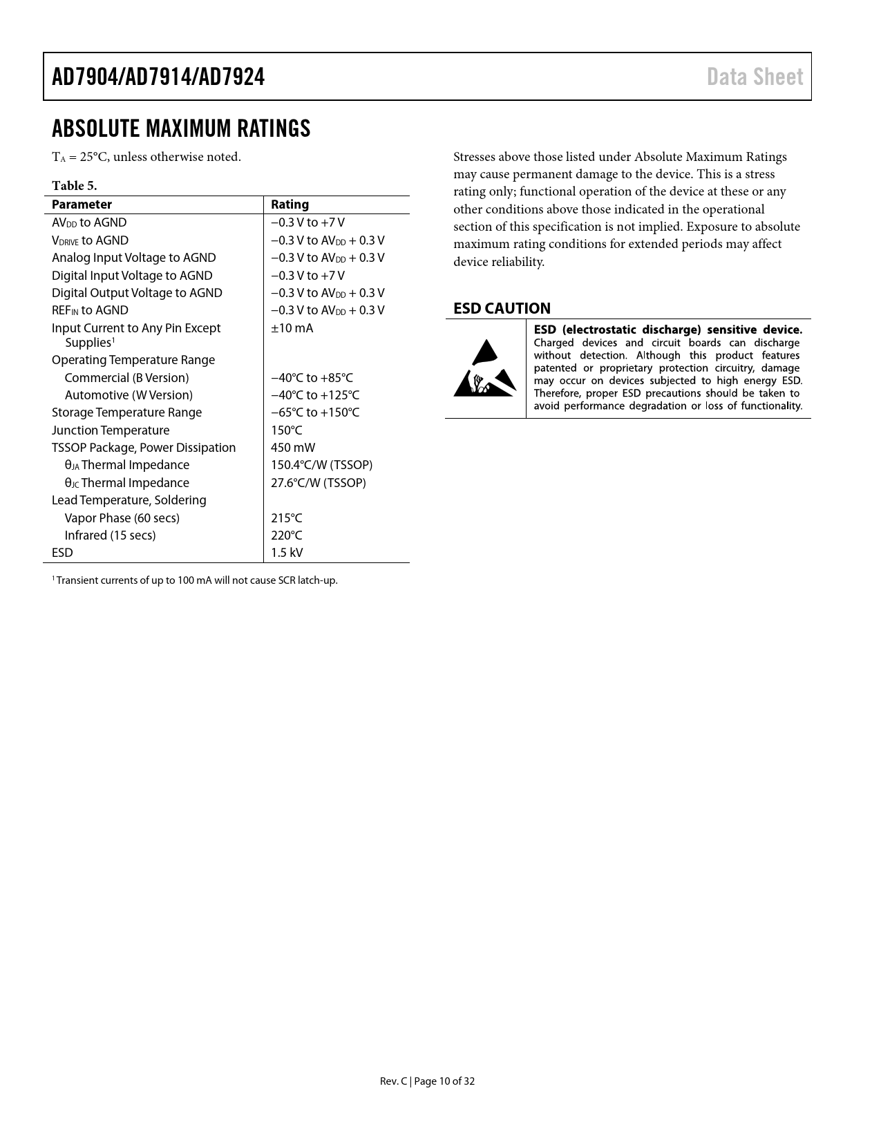 AD7904/AD7914/AD7924. Data Sheet. ABSOLUTE MAXIMUM RATINGS. Table 5. Parameter. Rating. ESD CAUTION