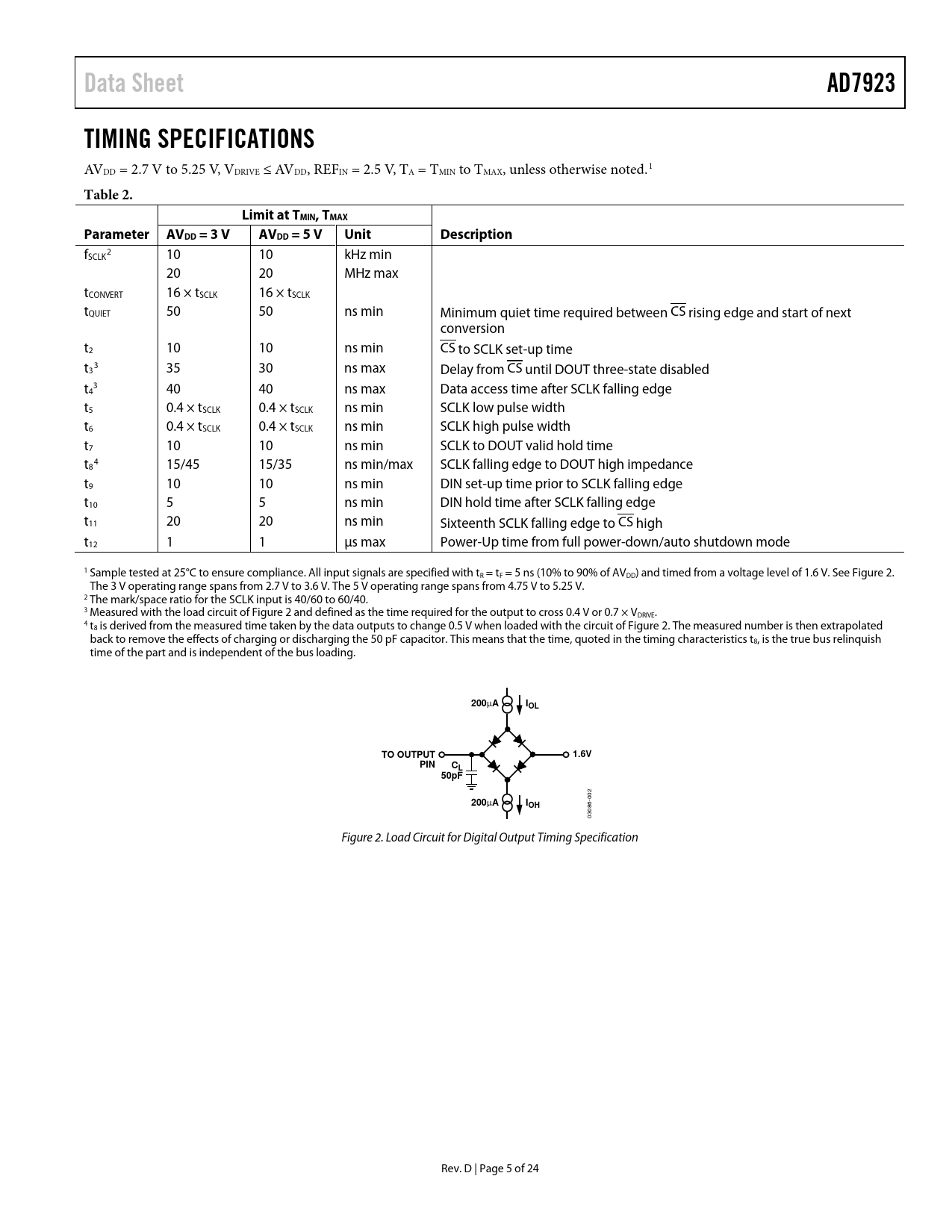 link to page 6 link to page 6 link to page 6 link to page 6 link to page 6 link to page 6 link to page 6 Data SheetAD7923TIMING SPECIFICATIONS AVDD = 2.7 V to 5.25 V, VDRIVE ≤ AVDD, REFIN = 2.5 V, TA = TMIN to TMAX, unless otherwise noted.1 Table 2.Limit at TMIN, TMAXParameter AVDD = 3 VAVDD = 5 VUnitDescription f 2 SCLK 10 10 kHz min 20 20 MHz max tCONVERT 16 × tSCLK 16 × tSCLK tQUIET 50 50 ns min Minimum quiet time required between CS rising edge and start of next conversion t2 10 10 ns min CS to SCLK set-up time t 3 3 35 30 ns max Delay from CS until DOUT three-state disabled t 3 4 40 40 ns max Data access time after SCLK falling edge t5 0.4 × tSCLK 0.4 × tSCLK ns min SCLK low pulse width t6 0.4 × tSCLK 0.4 × tSCLK ns min SCLK high pulse width t7 10 10 ns min SCLK to DOUT valid hold time t 4 8 15/45 15/35 ns min/max SCLK falling edge to DOUT high impedance t9 10 10 ns min DIN set-up time prior to SCLK falling edge t10 5 5 ns min DIN hold time after SCLK falling edge t11 20 20 ns min Sixteenth SCLK falling edge to CS high t12 1 1 µs max Power-Up time from full power-down/auto shutdown mode 1 Sample tested at 25°C to ensure compliance. All input signals are specified with tR = tF = 5 ns (10% to 90% of AVDD) and timed from a voltage level of 1.6 V. See Figure 2. The 3 V operating range spans from 2.7 V to 3.6 V. The 5 V operating range spans from 4.75 V to 5.25 V. 2 The mark/space ratio for the SCLK input is 40/60 to 60/40. 3 Measured with the load circuit of Figure 2 and defined as the time required for the output to cross 0.4 V or 0.7 × VDRIVE. 4 t8 is derived from the measured time taken by the data outputs to change 0.5 V when loaded with the circuit of Figure 2. The measured number is then extrapolated back to remove the effects of charging or discharging the 50 pF capacitor. This means that the time, quoted in the timing characteristics t8, is the true bus relinquish time of the part and is independent of the bus loading. 200 µ AIOLTO OUTPUT1.6VPINCL50pF200 µ AIOH 03086-002 Figure 2. Load Circuit for Digital Output Timing Specification Rev. D | Page 5 of 24 Document Outline Specifications Timing Specifications Absolute Maximum Ratings ESD Caution Pin Configuration and Function Description Typical Performance Characteristics Terminology Control Register Descriptions Sequencer Operation Theory of Operation Circuit Information Converter Operation Analog Input ADC Transfer Function Handling Bipolar Input Signals Typical Connection Diagram Analog Input Selection Digital Inputs VDRIVE Reference Modes of Operation Normal Mode (PM1 = PM0 = 1) Full Shutdown (PM1 = 1, PM0 = 0) Auto Shutdown (PM1 = 0, PM0 = 1) Powering Up the AD7923 Power vs. Throughput Rate Serial Interface Writing Between Conversions Microprocessor Interfacing AD7923-to-TMS320C541 AD7923-to-ADSP-21xx AD7923-to-DSP563xx Application Hints Grounding and Layout Outline Dimensions Ordering Guide Automotive Products