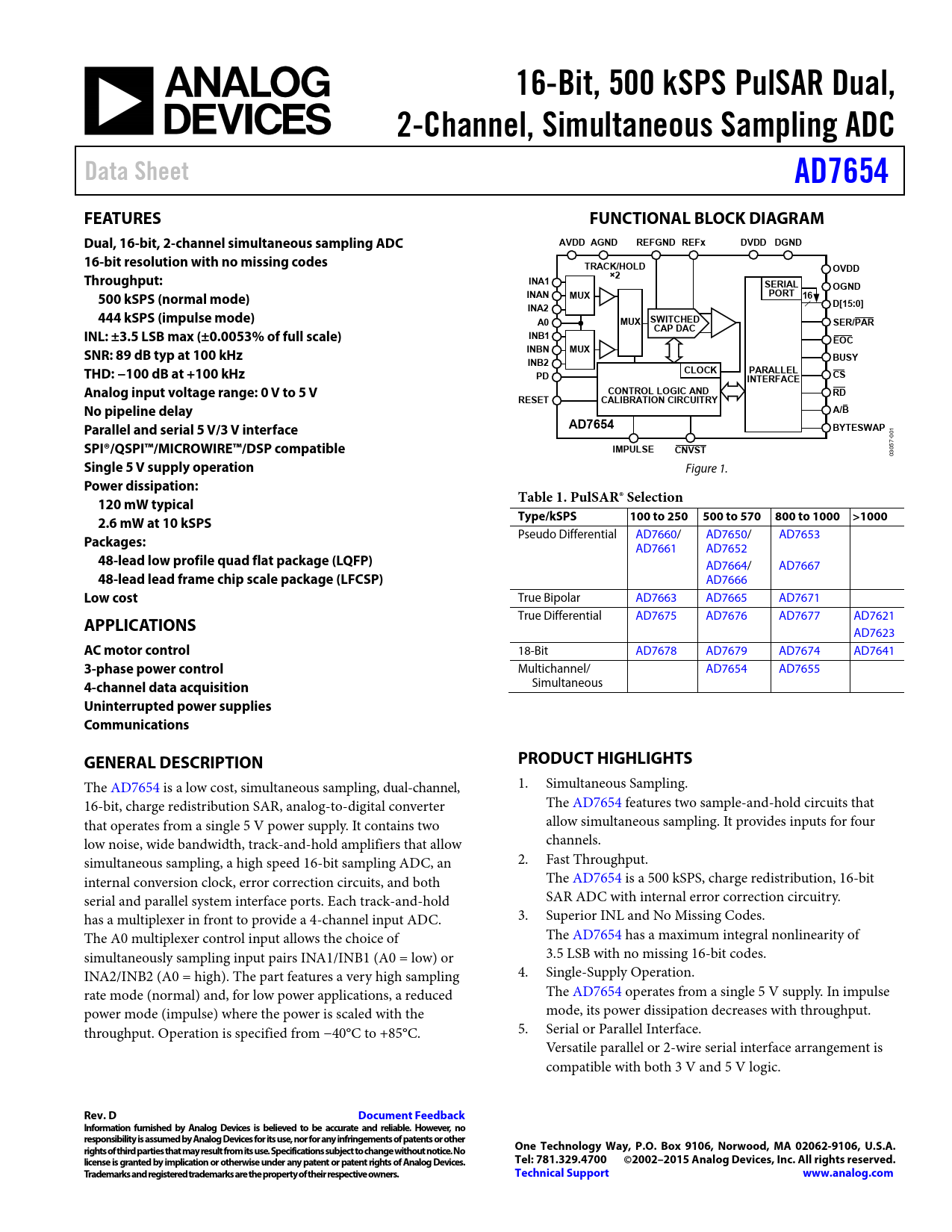 16-Bit, 500 kSPS PulSAR Dual,. 2-Channel, Simultaneous Sampling ADC. Data Sheet. AD7654. FEATURES. FUNCTIONAL BLOCK DIAGRAM