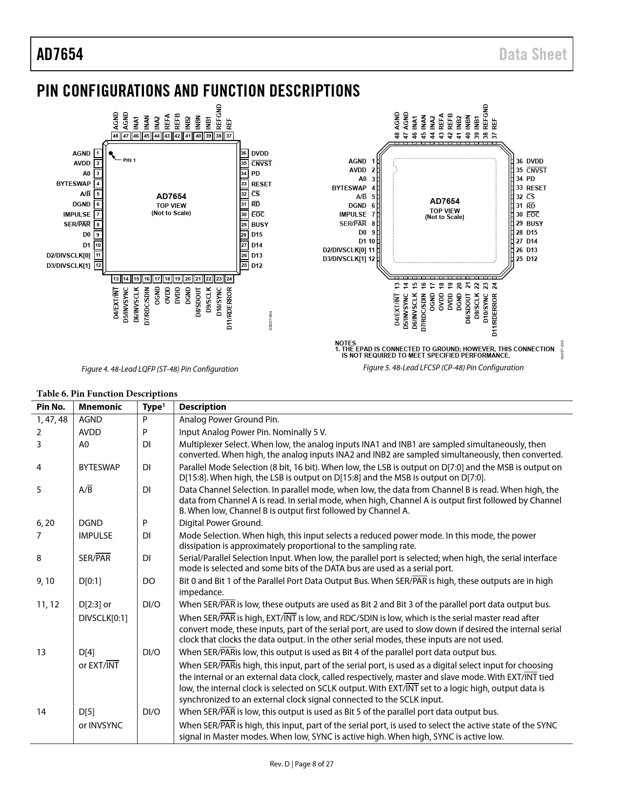 AD7654 Data Sheet PIN CONFIGURATIONS AND FUNCTION DESCRIPTIONS REF 48 47 46 45 44 43 42 41 40 39 38 37 AGND 1 36 DVDD AVDD