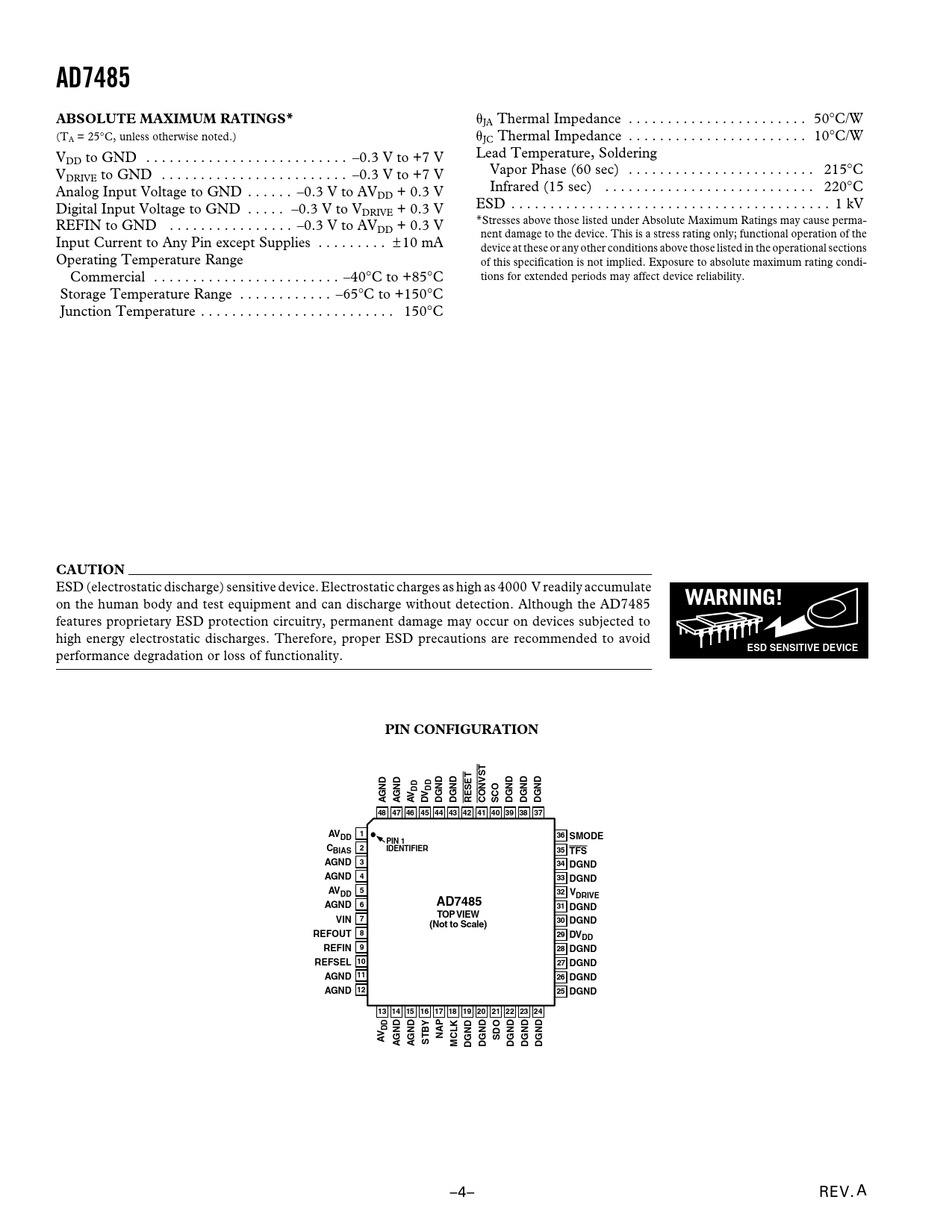 AD7485ABSOLUTE MAXIMUM RATINGS* JA Thermal Impedance . 50°C/W (T A = 25°C, unless otherwise noted.) JC Thermal Impedance . 10°C/W V Lead Temperature, Soldering DD to GND . –0.3 V to +7 V V Vapor Phase (60 sec) . 215°C DRIVE to GND . –0.3 V to +7 V Analog Input Voltage to GND . –0.3 V to AV Infrared (15 sec) . 220°C DD + 0.3 V Digital Input Voltage to GND . –0.3 V to V ESD . 1 kV DRIVE + 0.3 V REFIN to GND . –0.3 V to AV *Stresses above those listed under Absolute Maximum Ratings may cause perma- DD + 0.3 V nent damage to the device. This is a stress rating only; functional operation of the Input Current to Any Pin except Supplies . ± 10 mA device at these or any other conditions above those listed in the operational sections Operating Temperature Range of this specification is not implied. Exposure to absolute maximum rating condi- Commercial . –40°C to +85°C tions for extended periods may affect device reliability. Storage Temperature Range . –65°C to +150°C Junction Temperature . 150°C CAUTION ESD (electrostatic discharge) sensitive device. Electrostatic charges as high as 4000 V readily accumulate WARNING! on the human body and test equipment and can discharge without detection. Although the AD7485 features proprietary ESD protection circuitry, permanent damage may occur on devices subjected to high energy electrostatic discharges. Therefore, proper ESD precautions are recommended to avoid ESD SENSITIVE DEVICE performance degradation or loss of functionality. PIN CONFIGURATIONDDDDGNDGNDAAAVDVDGNDDGNDRESETCONVSTSCODGNDDGNDDGND48 47 46 45 44 43 42 41 40 39 38 37AV136DDSMODEPIN 1C2IDENTIFIERBIAS35 TFSAGND 334 DGNDAGND 433 DGNDAV532DDVDRIVEAGND 6AD748531 DGNDTOP VIEWVIN 730(Not to Scale)DGNDREFOUT 829 DVDDREFIN 928 DGNDREFSEL 1027 DGND11AGND26 DGNDAGND 1225 DGND13 14 15 16 17 18 19 20 21 22 23 24DDAVGNDGNDNAPSDOAASTBYMCLKDGNDDGNDDGNDDGNDDGND –4– REV. A Document Outline FEATURES GENERAL DESCRIPTION FUNCTIONAL BLOCK DIAGRAM SPECIFICATIONS ABSOLUTE MAXIMUM RATINGS ORDERING GUIDE PIN CONFIGURATION PIN FUNCTION DESCRIPTIONS TERMINOLOGY Integral Nonlinearity Differential Nonlinearity Offset Error Gain Error Track/Hold Acquisition Time Signal to (Noise + Distortion) Ratio Total Harmonic Distortion Peak Harmonic or Spurious Noise Intermodulation Distortion Typical Performance Characteristics CIRCUIT DESCRIPTION CONVERTER OPERATION ADC TRANSFER FUNCTION POWER SAVING SERIAL INTERFACE Driving the CONVST Pin Board Layout and Grounding OUTLINE DIMENSIONS