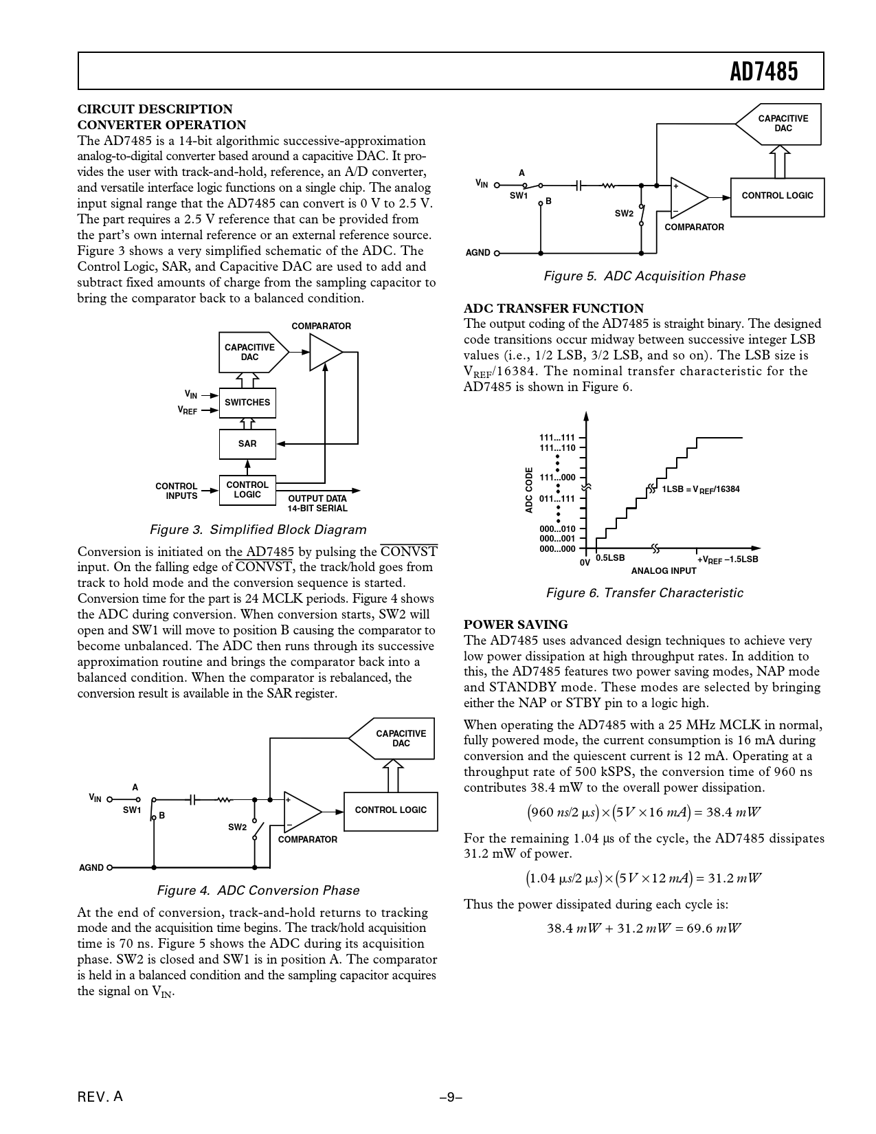 AD7485CIRCUIT DESCRIPTIONCAPACITIVECONVERTER OPERATIONDAC The AD7485 is a 14-bit algorithmic successive-approximation analog-to-digital converter based around a capacitive DAC. It pro- vides the user with track-and-hold, reference, an A/D converter, A and versatile interface logic functions on a single chip. The analog VIN+SW1CONTROL LOGIC input signal range that the AD7485 can convert is 0 V to 2.5 V. B–SW2 The part requires a 2.5 V reference that can be provided from COMPARATOR the part’s own internal reference or an external reference source. Figure 3 shows a very simplified schematic of the ADC. The AGND Control Logic, SAR, and Capacitive DAC are used to add and subtract fixed amounts of charge from the sampling capacitor to Figure 5. ADC Acquisition Phase bring the comparator back to a balanced condition. ADC TRANSFER FUNCTIONCOMPARATOR The output coding of the AD7485 is straight binary. The designed code transitions occur midway between successive integer LSB CAPACITIVEDAC values (i.e., 1/2 LSB, 3/2 LSB, and so on). The LSB size is VREF/16384. The nominal transfer characteristic for the AD7485 is shown in Figure 6. VINSWITCHESVREF111...111SAR111...110111...000CONTROLCONTROL1LSB = V REF/16384INPUTSLOGICOUTPUT DATA011...11114-BIT SERIALADC CODE Figure 3. Simplified Block Diagram 000...010 000...001 Conversion is initiated on the AD7485 by pulsing the CONVST 000...0000.5LSB+V input. On the falling edge of CONVST, the track/hold goes from 0VREF –1.5LSBANALOG INPUT track to hold mode and the conversion sequence is started. Conversion time for the part is 24 MCLK periods. Figure 4 shows Figure 6. Transfer Characteristic the ADC during conversion. When conversion starts, SW2 will open and SW1 will move to position B causing the comparator to POWER SAVING become unbalanced. The ADC then runs through its successive The AD7485 uses advanced design techniques to achieve very approximation routine and brings the comparator back into a low power dissipation at high throughput rates. In addition to balanced condition. When the comparator is rebalanced, the this, the AD7485 features two power saving modes, NAP mode conversion result is available in the SAR register. and STANDBY mode. These modes are selected by bringing either the NAP or STBY pin to a logic high. When operating the AD7485 with a 25 MHz MCLK in normal, CAPACITIVEDAC fully powered mode, the current consumption is 16 mA during conversion and the quiescent current is 12 mA. Operating at a throughput rate of 500 kSPS, the conversion time of 960 ns A contributes 38.4 mW to the overall power dissipation. VIN+SW1CONTROL LOGIC ( ) ( ) B ns/ s × V × mA = . mW 960 2 5 16 38 4 –SW2COMPARATOR For the remaining 1.04 µs of the cycle, the AD7485 dissipates 31.2 mW of power. AGND . /s s V mA . mW ( )×( × ) = Figure 4. ADC Conversion Phase 1 04 2 5 12 31 2 Thus the power dissipated during each cycle is: At the end of conversion, track-and-hold returns to tracking mode and the acquisition time begins. The track/hold acquisition 38 4 . mW + 31 2 . mW = 69 6 . mW time is 70 ns. Figure 5 shows the ADC during its acquisition phase. SW2 is closed and SW1 is in position A. The comparator is held in a balanced condition and the sampling capacitor acquires the signal on VIN. REV. A –9– Document Outline FEATURES GENERAL DESCRIPTION FUNCTIONAL BLOCK DIAGRAM SPECIFICATIONS ABSOLUTE MAXIMUM RATINGS ORDERING GUIDE PIN CONFIGURATION PIN FUNCTION DESCRIPTIONS TERMINOLOGY Integral Nonlinearity Differential Nonlinearity Offset Error Gain Error Track/Hold Acquisition Time Signal to (Noise + Distortion) Ratio Total Harmonic Distortion Peak Harmonic or Spurious Noise Intermodulation Distortion Typical Performance Characteristics CIRCUIT DESCRIPTION CONVERTER OPERATION ADC TRANSFER FUNCTION POWER SAVING SERIAL INTERFACE Driving the CONVST Pin Board Layout and Grounding OUTLINE DIMENSIONS