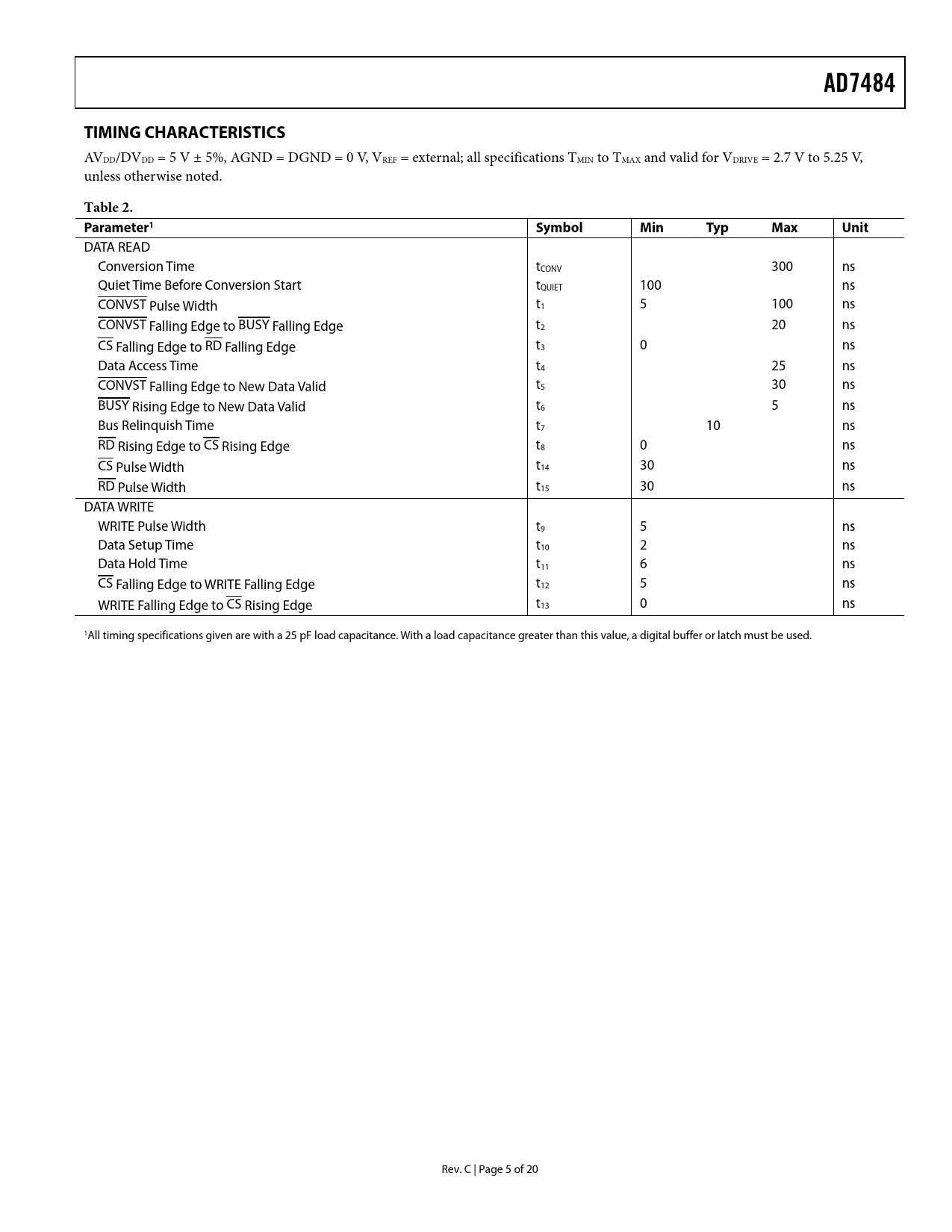 link to page 6 AD7484TIMING CHARACTERISTICS AVDD/DVDD = 5 V ± 5%, AGND = DGND = 0 V, VREF = external; all specifications TMIN to TMAX and valid for VDRIVE = 2.7 V to 5.25 V, unless otherwise noted. Table 2. Parameter1SymbolMinTypMaxUnit DATA READ Conversion Time tCONV 300 ns Quiet Time Before Conversion Start tQUIET 100 ns CONVST Pulse Width t1 5 100 ns CONVST Falling Edge to BUSY Falling Edge t2 20 ns CS Falling Edge to RD Falling Edge t3 0 ns Data Access Time t4 25 ns CONVST Falling Edge to New Data Valid t5 30 ns BUSY Rising Edge to New Data Valid t6 5 ns Bus Relinquish Time t7 10 ns RD Rising Edge to CS Rising Edge t8 0 ns CS Pulse Width t14 30 ns RD Pulse Width t15 30 ns DATA WRITE WRITE Pulse Width t9 5 ns Data Setup Time t10 2 ns Data Hold Time t11 6 ns CS Falling Edge to WRITE Falling Edge t12 5 ns WRITE Falling Edge to CS Rising Edge t13 0 ns 1All timing specifications given are with a 25 pF load capacitance. With a load capacitance greater than this value, a digital buffer or latch must be used. Rev. C | Page 5 of 20 Document Outline Features Functional Block Diagram General Description Revision History Specifications Timing Characteristics Absolute Maximum Ratings ESD Caution Pin Configuration and Function Descriptions Typical Performance Characteristics Terminology Circuit Description Converter Operation Analog Input ADC Transfer Function Power Saving Offset/Overrange Parallel Interface Reading Data from the AD7484 Writing to the AD7484 Driving the CONVST Pin Typical Connection Board Layout and Grounding Outline Dimensions Ordering Guide