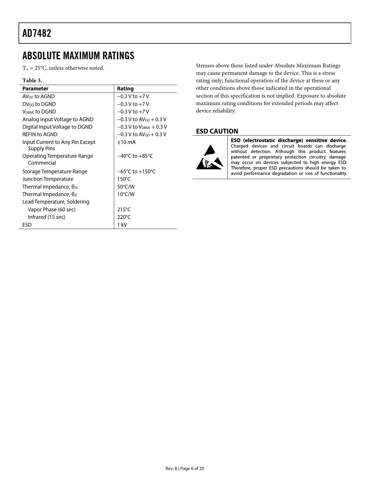AD7482ABSOLUTE MAXIMUM RATINGS T Stresses above those listed under Absolute Maximum Ratings A = 25°C, unless otherwise noted. may cause permanent damage to the device. This is a stress Table 3. rating only; functional operation of the device at these or any ParameterRating other conditions above those indicated in the operational AVDD to AGND −0.3 V to +7 V section of this specification is not implied. Exposure to absolute DVDD to DGND −0.3 V to +7 V maximum rating conditions for extended periods may affect VDRIVE to DGND −0.3 V to +7 V device reliability. Analog Input Voltage to AGND −0.3 V to AVDD + 0.3 V Digital Input Voltage to DGND −0.3 V to VDRIVE + 0.3 V ESD CAUTION REFIN to AGND −0.3 V to AVDD + 0.3 V Input Current to Any Pin Except ±10 mA Supply Pins Operating Temperature Range −40°C to +85°C Commercial Storage Temperature Range −65°C to +150°C Junction Temperature 150°C Thermal Impedance, θ JA 50°C/W Thermal Impedance, θJC 10°C/W Lead Temperature, Soldering Vapor Phase (60 sec) 215°C Infrared (15 sec) 220°C ESD 1 kV Rev. B | Page 6 of 20 Document Outline Features Functional Block Diagram General Description Revision History Specifications Timing Characteristics Absolute Maximum Ratings ESD Caution Pin Configuration and Function Descriptions Typical Performance Characteristics Terminology Circuit Description Converter Operation Analog Input ADC Transfer Function Power Saving Offset/Overrange Parallel Interface Reading Data from the AD7482 Writing to the AD7482 Driving the CONVST Pin Typical Connection Board Layout and Grounding Outline Dimensions Ordering Guide