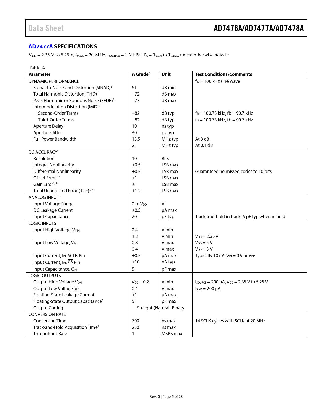 link to page 6 link to page 6 link to page 6 link to page 6 link to page 6 link to page 6 link to page 6 link to page 6 link to page 6 link to page 6 link to page 6 link to page 6 link to page 6 link to page 6 link to page 6 Data SheetAD7476A/AD7477A/AD7478AAD7477ASPECIFICATIONS VDD = 2.35 V to 5.25 V, fSCLK = 20 MHz, fSAMPLE = 1 MSPS, TA = TMIN to TMAX, unless otherwise noted.1 Table 2. ParameterA Grade2UnitTest Conditions/Comments DYNAMIC PERFORMANCE fIN = 100 kHz sine wave Signal-to-Noise-and-Distortion (SINAD)3 61 dB min Total Harmonic Distortion (THD)3 −72 dB max Peak Harmonic or Spurious Noise (SFDR)3 −73 dB max Intermodulation Distortion (IMD)3 Second-Order Terms −82 dB typ fa = 100.73 kHz, fb = 90.7 kHz Third-Order Terms −82 dB typ fa = 100.73 kHz, fb = 90.7 kHz Aperture Delay 10 ns typ Aperture Jitter 30 ps typ Full Power Bandwidth 13.5 MHz typ At 3 dB 2 MHz typ At 0.1 dB DC ACCURACY Resolution 10 Bits Integral Nonlinearity ±0.5 LSB max Differential Nonlinearity ±0.5 LSB max Guaranteed no missed codes to 10 bits Offset Error3, 4 ±1 LSB max Gain Error3, 4 ±1 LSB max Total Unadjusted Error (TUE)3, 4 ±1.2 LSB max ANALOG INPUT Input Voltage Range 0 to VDD V DC Leakage Current ±0.5 µA max Input Capacitance 20 pF typ Track-and-hold in track; 6 pF typ when in hold LOGIC INPUTS Input High Voltage, VINH 2.4 V min 1.8 V min VDD = 2.35 V Input Low Voltage, VINL 0.8 V max VDD = 5 V 0.4 V max VDD = 3 V Input Current, IIN, SCLK Pin ±0.5 μA max Typically 10 nA, VIN = 0 V or VDD Input Current, IIN, CS Pin ±10 nA typ Input Capacitance, C 5 IN 5 pF max LOGIC OUTPUTS Output High Voltage VOH VDD − 0.2 V min ISOURCE = 200 μA, VDD = 2.35 V to 5.25 V Output Low Voltage, VOL 0.4 V max ISINK = 200 μA Floating-State Leakage Current ±1 μA max Floating-State Output Capacitance5 5 pF max Output Coding Straight (Natural) Binary CONVERSION RATE Conversion Time 700 ns max 14 SCLK cycles with SCLK at 20 MHz Track-and-Hold Acquisition Time3 250 ns max Throughput Rate 1 MSPS max Rev. G | Page 5 of 28 Document Outline FEATURES APPLICATIONS FUNCTIONAL BLOCK DIAGRAM GENERAL DESCRIPTION PRODUCT HIGHLIGHTS TABLE OF CONTENTS REVISION HISTORY SPECIFICATIONS AD7476A SPECIFICATIONS AD7477A SPECIFICATIONS AD7478A SPECIFICATIONS TIMING SPECIFICATIONS Timing Diagrams ABSOLUTE MAXIMUM RATINGS ESD CAUTION PIN CONFIGURATIONS AND FUNCTION DESCRIPTIONS TYPICAL PERFORMANCE CHARACTERISTICS TERMINOLOGY THEORY OF OPERATION CIRCUIT INFORMATION THE CONVERTER OPERATION ADC TRANSFER FUNCTION TYPICAL CONNECTION DIAGRAM ANALOG INPUT DIGITAL INPUTS MODES OF OPERATION NORMAL MODE POWER-DOWN MODE POWER-UP TIME POWER VS. THROUGHPUT RATE SERIAL INTERFACE AD7478A IN A 12 SCLK CYCLE SERIAL INTERFACE MICROPROCESSOR INTERFACING AD7476A/AD7477A/AD7478A TO ADSP-2181 INTERFACE AD7476A/AD7477A/AD7478A TO DSP563xx INTERFACE APPLICATION HINTS GROUNDING AND LAYOUT OUTLINE DIMENSIONS ORDERING GUIDE AUTOMOTIVE PRODUCTS