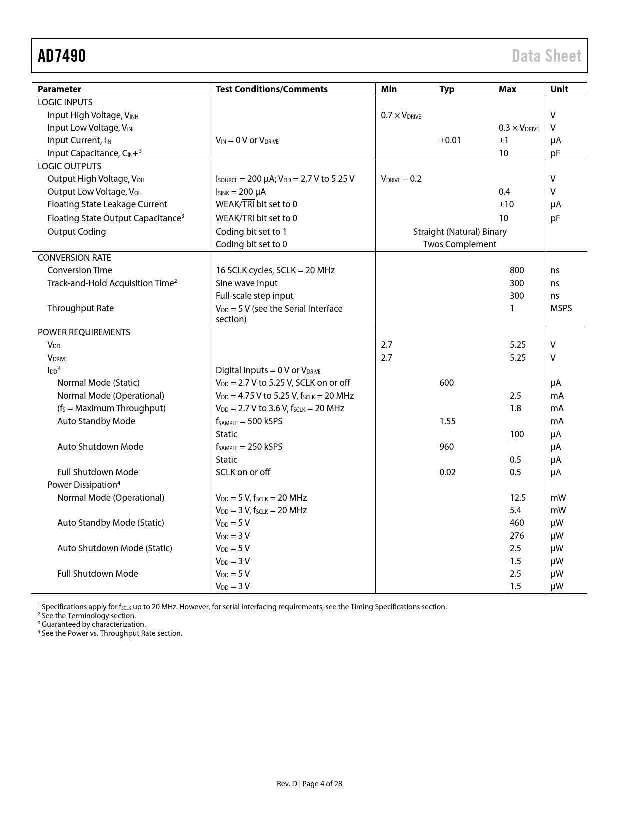 Seiten / Seite29 / 5 — AD7490. Data Sheet. Parameter. Test Conditions/Comments. Min. Typ. Max. …