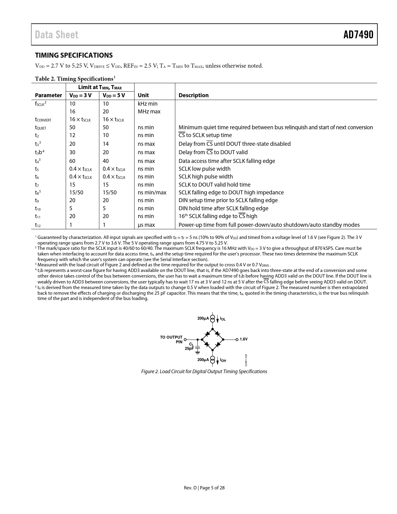 f 2 SCLK 10 10 kHz min 16 20 MHz max tCONVERT 16 × tSCLK 16 × tSCLK tQUIET 50 50 ns min Minimum quiet time required between bus relinquish and start of next conversion t2 12 10 ns min CS to SCLK setup time t 3 3 20 14 ns max Delay from CS until DOUT three-state disabled t3b4 30 20 ns max Delay from CS to DOUT valid t 3 4 60 40 ns max Data access time after SCLK falling edge t5 0.4 × tSCLK 0.4 × tSCLK ns min SCLK low pulse width t6 0.4 × tSCLK 0.4 × tSCLK ns min SCLK high pulse width t7 15 15 ns min SCLK to DOUT valid hold time t 5 8 15/50 15/50 ns min/max SCLK falling edge to DOUT high impedance t9 20 20 ns min DIN setup time prior to SCLK falling edge t10 5 5 ns min DIN hold time after SCLK falling edge t11 20 20 ns min 16th SCLK falling edge to CS high t12 1 1 µs max Power-up time from full power-down/auto shutdown/auto standby modes 1 Guaranteed by characterization. All input signals are specified with tR = tF = 5 ns (10% to 90% of VDD) and timed from a voltage level of 1.6 V (see Figure 2). The 3 V operating range spans from 2.7 V to 3.6 V. The 5 V operating range spans from 4.75 V to 5.25 V. 2 The mark/space ratio for the SCLK input is 40/60 to 60/40. The maximum SCLK frequency is 16 MHz with VDD = 3 V to give a throughput of 870 kSPS. Care must be taken when interfacing to account for data access time, t4, and the setup time required for the user’s processor. These two times determine the maximum SCLK frequency with which the user’s system can operate (see the Serial Interface section). 3 Measured with the load circuit of Figure 2 and defined as the time required for the output to cross 0.4 V or 0.7 VDRIVE . 4 t3b represents a worst-case figure for having ADD3 available on the DOUT line, that is, if the AD7490 goes back into three-state at the end of a conversion and some other device takes control of the bus between conversions, the user has to wait a maximum time of t3b before having ADD3 valid on the DOUT line. If the DOUT line is weakly driven to ADD3 between conversions, the user typically has to wait 17 ns at 3 V and 12 ns at 5 V after the CS falling edge before seeing ADD3 valid on DOUT. 5 t8 is derived from the measured time taken by the data outputs to change 0.5 V when loaded with the circuit of Figure 2. The measured number is then extrapolated back to remove the effects of charging or discharging the 25 pF capacitor. This means that the time, t8, quoted in the timing characteristics, is the true bus relinquish time of the part and is independent of the bus loading.