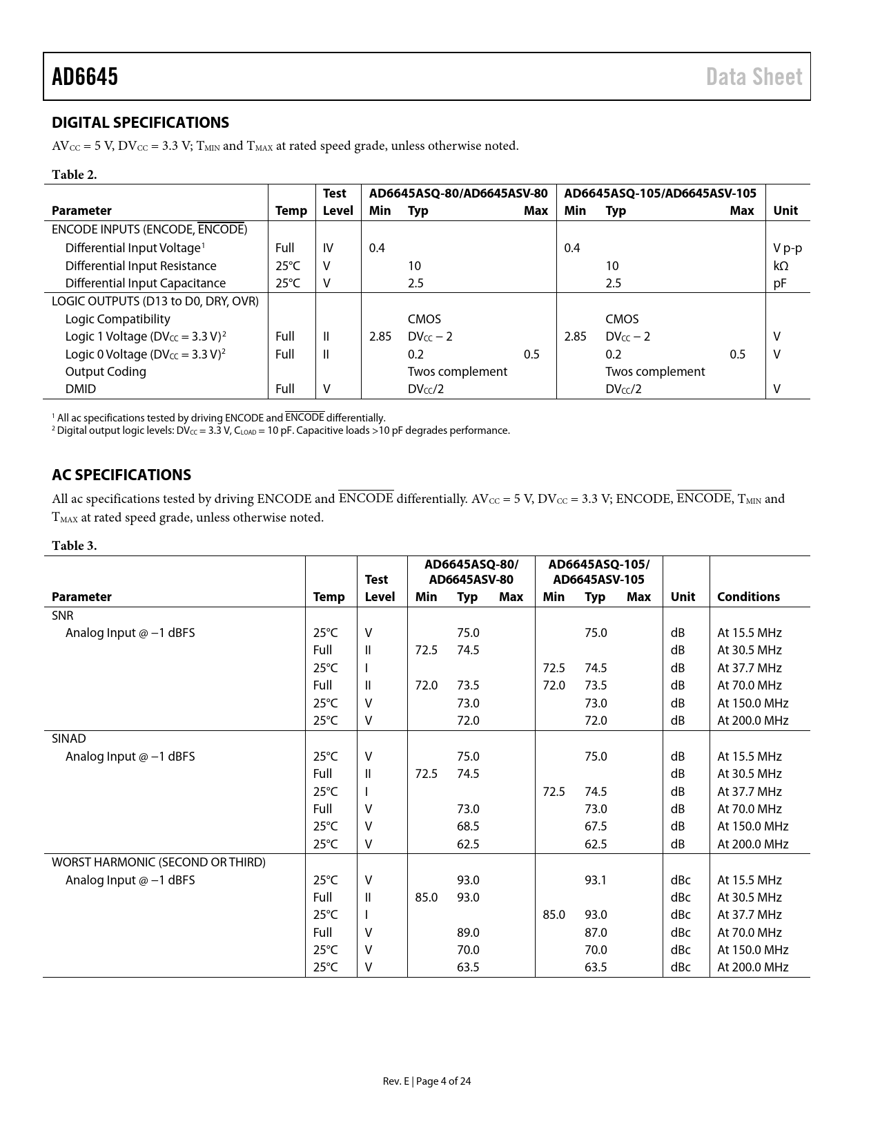 AD6645 Data Sheet DIGITAL SPECIFICATIONS Table 2 Test AD6645ASQ-80/AD6645ASV-80 AD6645ASQ-105/AD6645ASV-105 Parameter