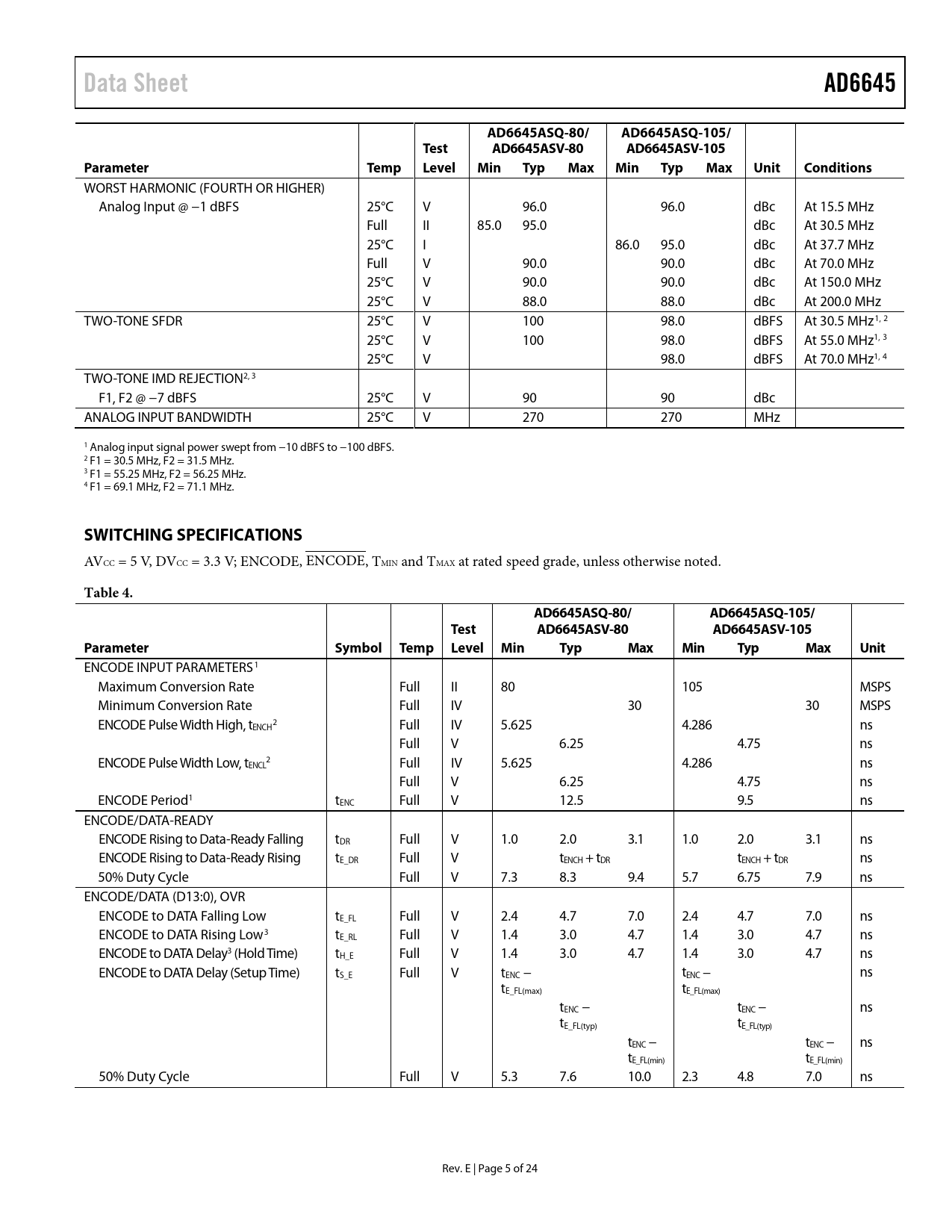 Data Sheet. AD6645. AD6645ASQ-80/. AD6645ASQ-105/. Test. AD6645ASV-80. AD6645ASV-105. Parameter. Temp. Level Min. Typ. Max. Min. Unit. Conditions