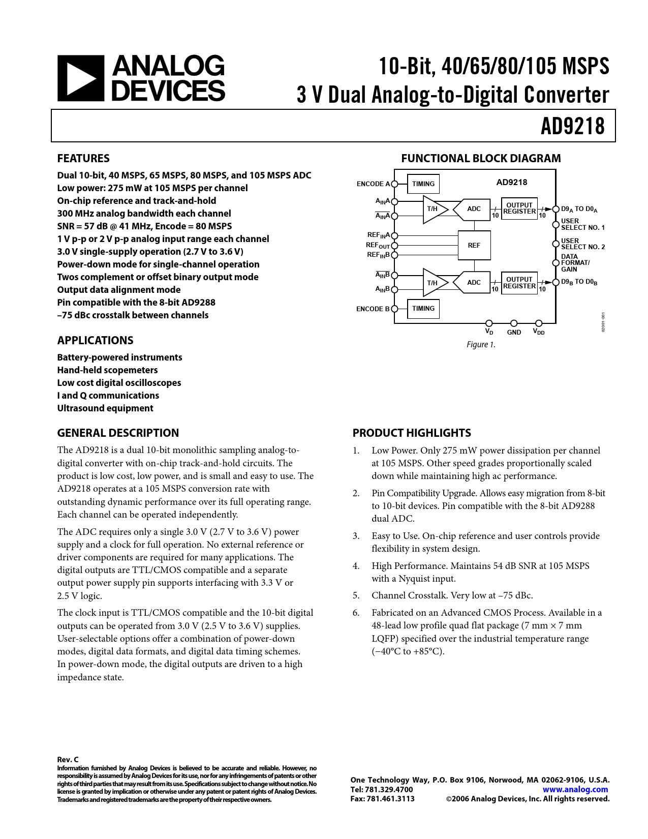 | Seiten / Seite | 29 / 1 — 10-Bit, 40/65/80/105 MSPS. 3 V Dual Analog-to-Digital Converter. AD9218. … |