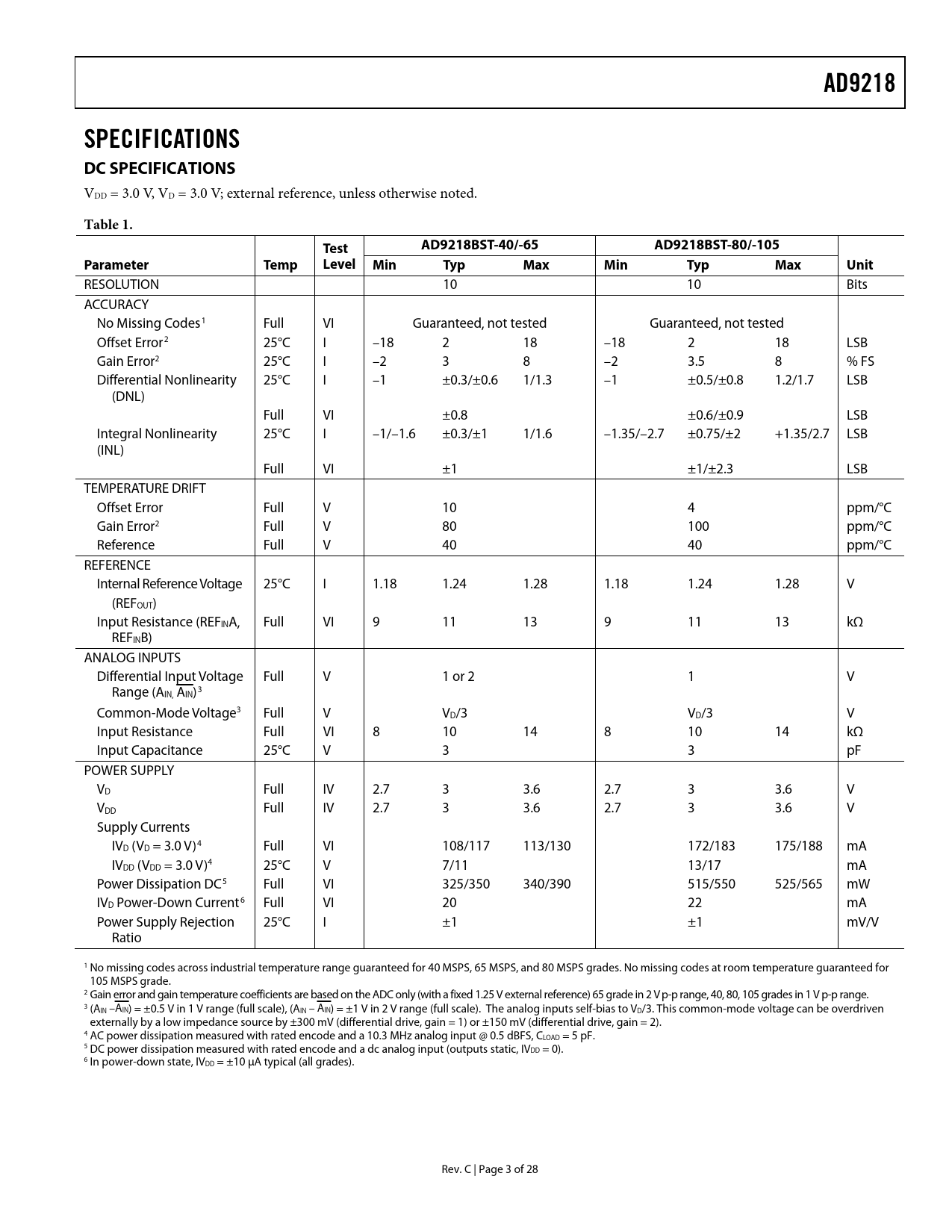 Seiten / Seite29 / 4 — AD9218. SPECIFICATIONS DC SPECIFICATIONS. Table 1. AD9218BST-40/-65. …