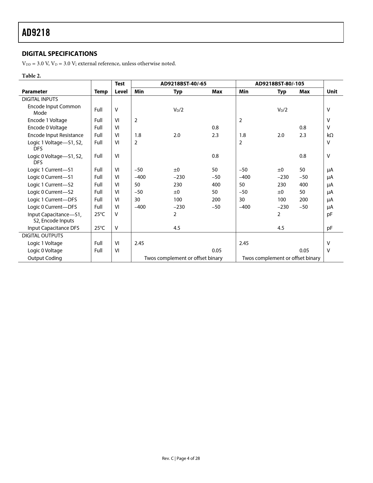 AD9218. DIGITAL SPECIFICATIONS. Table 2. Test. AD9218BST-40/-65. AD9218BST-80/-105. Parameter. Temp Level Min. Typ. Max. Min. Unit