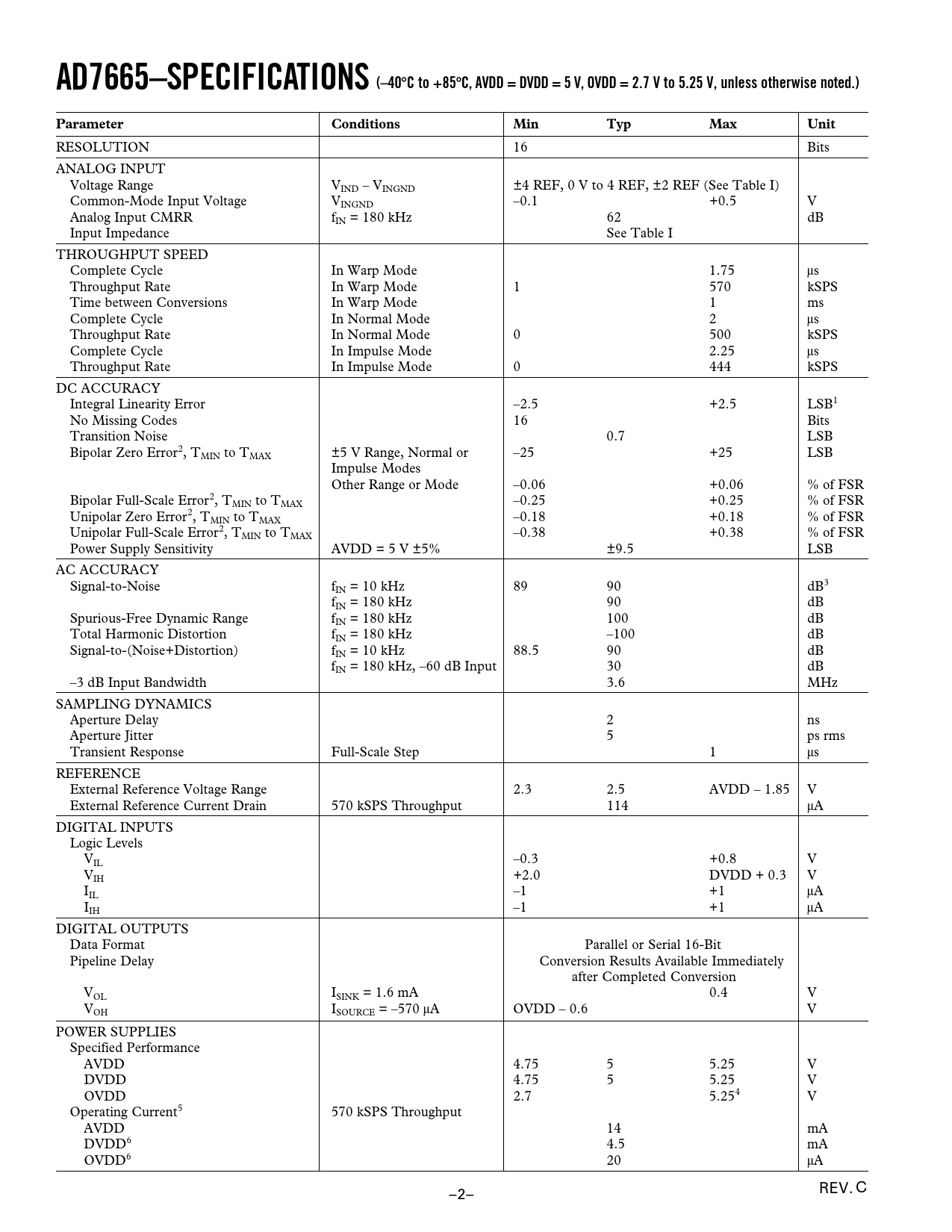 AD7665–SPECIFICATIONS (–40 C to +85 C, AVDD = DVDD = 5 V, OVDD = 2.7 V to 5.25 V, unless otherwise noted.) Parameter