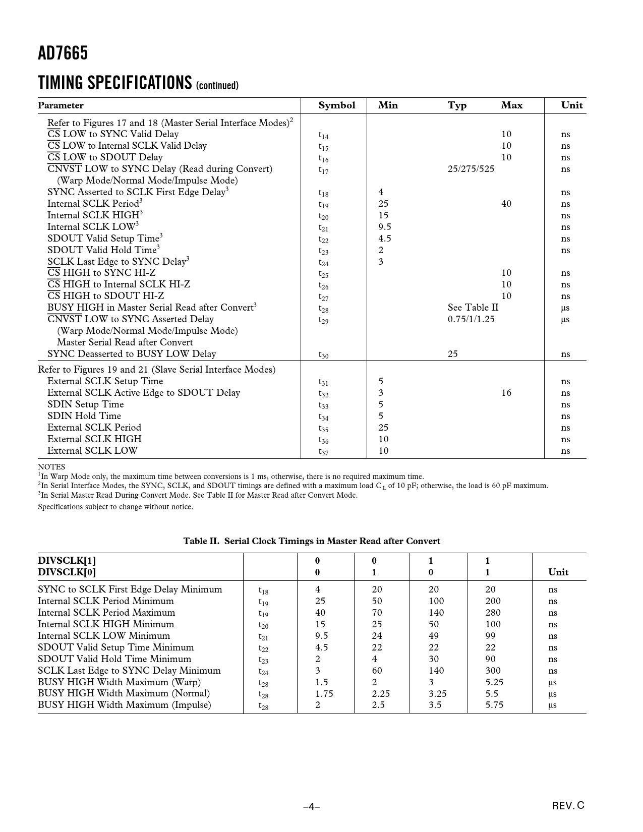 AD7665TIMING SPECIFICATIONS (continued)ParameterSymbolMinTypMaxUnit Refer to Figures 17 and 18 (Master Serial Interface Modes)2 CS LOW to SYNC Valid Delay t14 10 ns CS LOW to Internal SCLK Valid Delay t15 10 ns CS LOW to SDOUT Delay t16 10 ns CNVST LOW to SYNC Delay (Read during Convert) t17 25/275/525 ns (Warp Mode/Normal Mode/Impulse Mode) SYNC Asserted to SCLK First Edge Delay3 t18 4 ns Internal SCLK Period3 t19 25 40 ns Internal SCLK HIGH3 t20 15 ns Internal SCLK LOW3 t21 9.5 ns SDOUT Valid Setup Time3 t22 4.5 ns SDOUT Valid Hold Time3 t23 2 ns SCLK Last Edge to SYNC Delay3 t24 3 CS HIGH to SYNC HI-Z t25 10 ns CS HIGH to Internal SCLK HI-Z t26 10 ns CS HIGH to SDOUT HI-Z t27 10 ns BUSY HIGH in Master Serial Read after Convert3 t28 See Table II µs CNVST LOW to SYNC Asserted Delay t29 0.75/1/1.25 µs (Warp Mode/Normal Mode/Impulse Mode) Master Serial Read after Convert SYNC Deasserted to BUSY LOW Delay t30 25 ns Refer to Figures 19 and 21 (Slave Serial Interface Modes) External SCLK Setup Time t31 5 ns External SCLK Active Edge to SDOUT Delay t32 3 16 ns SDIN Setup Time t33 5 ns SDIN Hold Time t34 5 ns External SCLK Period t35 25 ns External SCLK HIGH t36 10 ns External SCLK LOW t37 10 ns NOTES 1In Warp Mode only, the maximum time between conversions is 1 ms, otherwise, there is no required maximum time. 2In Serial Interface Modes, the SYNC, SCLK, and SDOUT timings are defined with a maximum load C L of 10 pF; otherwise, the load is 60 pF maximum. 3In Serial Master Read During Convert Mode. See Table II for Master Read after Convert Mode. Specifications subject to change without notice. Table II. Serial Clock Timings in Master Read after ConvertDIVSCLK[1]0011DIVSCLK[0]0101Unit SYNC to SCLK First Edge Delay Minimum t18 4 20 20 20 ns Internal SCLK Period Minimum t19 25 50 100 200 ns Internal SCLK Period Maximum t19 40 70 140 280 ns Internal SCLK HIGH Minimum t20 15 25 50 100 ns Internal SCLK LOW Minimum t21 9.5 24 49 99 ns SDOUT Valid Setup Time Minimum t22 4.5 22 22 22 ns SDOUT Valid Hold Time Minimum t23 2 4 30 90 ns SCLK Last Edge to SYNC Delay Minimum t24 3 60 140 300 ns BUSY HIGH Width Maximum (Warp) t28 1.5 2 3 5.25 µs BUSY HIGH Width Maximum (Normal) t28 1.75 2.25 3.25 5.5 µs BUSY HIGH Width Maximum (Impulse) t28 2 2.5 3.5 5.75 µs –4– REV. C